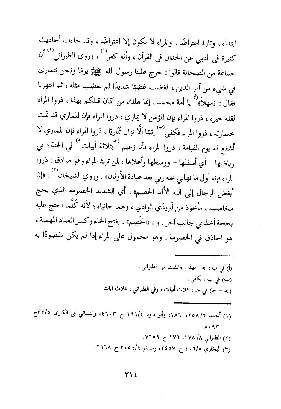 ابتداء، وتارة اعتراضًا. والراء لا يكون إلا اعتراضًا، وقد جاءت أحاديث كثيرة في النهي عن الجدال في القرآن، وأنه كفر (¬1)، وروى الطبراني (¬2) أن جماعة من الصحابة قالوا: خرج علينا رسول الله - صلى الله عليه وسلم - يومًا ونحن نتمارى في شيء من أمر الدين، فغضب غضبًا شديدًا لم يغضب مثله، ثم انتهرنا فقال: "مهلًا" (أ) يا أمة محمد، إنما هلك من كان قبلكم بهذا، ذروا الراء لقلة خيره، ذروا الراء فإن المؤمن لا يماري، ذروا المراء فإن المماري قد تمت خسارته، ذروا المراء فكفى (ب) إثمًا ألا تزال مُمَاريًا، ذروا المراء فإن المماري لا أشفع له يوم القيامة، ذروا المراء فأنا زعيم (جـ بثلاثة أبيات جـ) في الجنة؛ في رباضها -أي أسفلها- ووسطها وأعلاها، لمن ترك المراء وهو صادق، ذروا المراء فإنه أول ما نهاني عنه ربي بعد عبادة الأوثان". وروي الشيخان (¬3): "إن أبغض الرجال إلى الله الألد الخصم". أي الشديد الخصومة الذي يحج مخاصمه، مأخوذ من لَدِيدَي الوادي، وهما جانباه؛ لأنه كُلَّما احتج عليه بحجة أخذ في جانب آخر. و: "الخَصِم". بفتح الخاء وكسر الصاد المهملة، هو الحاذق في الخصومة. وهو محمول على المراء إذا لم يكن مقصودًا به