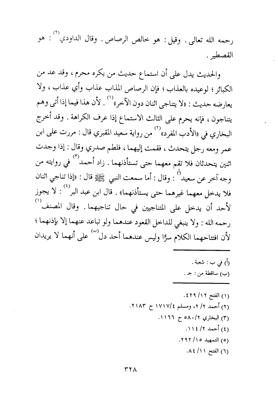 والحديث يدل على أن استماع حديث من يكره محرم، وقد عد من الكبائر؛ لوعيده بالعذاب؛ فإن الرصاص المذاب عذاب وأي عذاب، ولا يعارضه حديث: "لا يتناجى اثنان دون الآخر" (¬2). لأن هذا فيما إذا أتى وهم يتناجون، فإنه يحرم على الثالث الاستماع إذا عرف الكراهة. وقد أخرج البخاري في "الأدب الفرد" (¬3) من رواية سعيد المقبري قال: مررت على ابن عمر ومعه رجل يتحدث، فقمت إليهما، فلطم صدري وقال: إذا وجدت اثنين يتحدثان فلا تقم معهما حتى تستأذنهما. زاد أحمد (¬4) في روايته من وجه آخر عن سعيد (أ): وقال: أما سمعت النبي - صلى الله عليه وسلم - قال: "إذا تناجى اثنان فلا يدخل معهما غيرهما حتى يستأذنهما". قال ابن عبد البر (¬5): لا يجوز لأحد أن يدخل على المتناجيين في حال تناجيهما. وقال المصنف (¬6) رحمه الله: ولا ينبغي للداخل القعود عندهما ولو تباعد عنهما إلا بإذنهما؛ لأن افتتاحهما الكلام سرًّا وليس عندهما أحد دل (ب) على أنهما لا يريدان