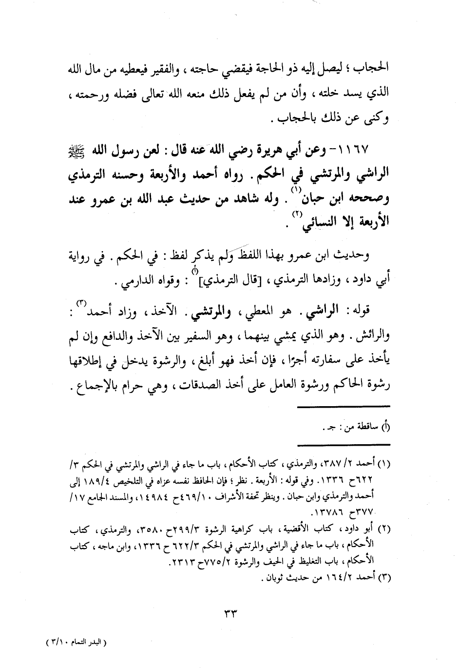 1167 - وعن أبي هريرة رضي الله عنه قال: لعن رسول الله - صلى الله عليه وسلم - الراشي والمرتشي في الحكم. رواه أحمد والأربعة وحسنه الترمذي وصححه ابن حبان (¬1). وله شاهد من حديث عبد الله بن عمرو عند الأربعة إلا النسائي (¬2).
