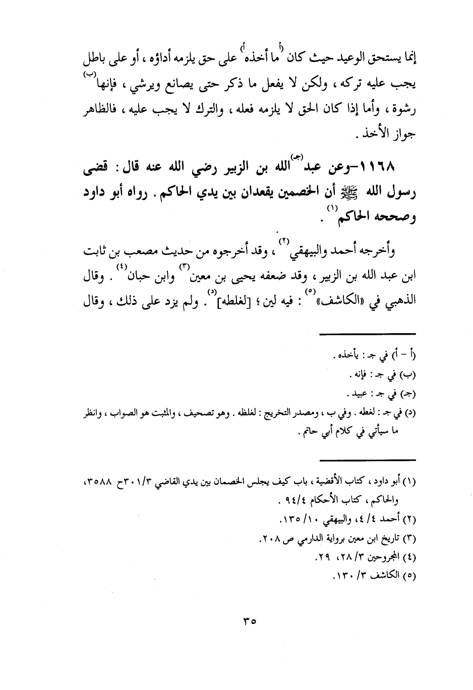1168 - وعن عبد (جـ) الله بن الزبير رضي الله عنه قال: قضى رسول الله - صلى الله عليه وسلم - أن الخصمين يقعدان بين يدي الحاكم. رواه أبو داود وصححه الحاكم (¬1).