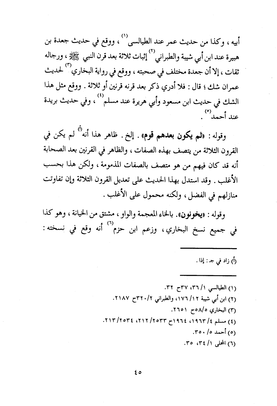 وقوله: "ثم يكون بعدهم قوم". إلخ. ظاهر هذا أنه (أ) لم يكن في القرون الثلاثة من يتصف بهذه الصفات، والظاهر في القرنين بعد الصحابة أنه قد كان فيهم من هو متصف بالصفات المذمومة، ولكن هذا بحسب الأغلب. وقد استدل بهذا الحديث على تعديل القرون الثلاثة وإن تفاوتت منازلهم في الفضل، ولكنه محمول على الأغلب.