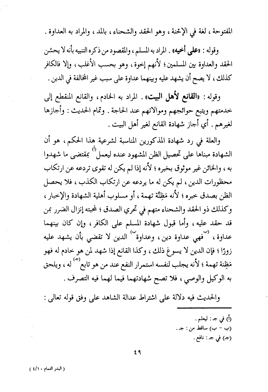 والعلة في رد شهادة المذكورين المناسبة لشرعية هذا الحكم، هو أن الشهادة مبناها على تحصيل الظن المشهود عنده ليعمل (أ) بمقتضى ما شهدوا به، والخائن غير موثوق بخبره؛ لأنه إذا لم يكن له تقوى تردعه عن ارتكاب محظورات الدين، لم يكن له ما يردعه عن ارتكاب الكذب، فلا يحصل الظن بصدق خبره؛ لأنه مَظِنَّة تهمة، أو مسلوب أهلية الشهادة والإخبار، وكذلك ذو الحقد والشحناء متهم في تحري الصدق؛ لمحبته إنزال الضرر بمن قد حقد عليه، وأما قبول شهادة المسلم على الكافر، وإن كان بينهما عداوة، (ب فهي عداوة دين، وعداوة ب) الدين لا تقضي بأن يشهد عليه زورًا؛ فإن الدين لا يسوغ ذلك، وكذا القانع إذا شهد لمن هو خادم له فهو مَظِنة تهمة؛ لأنه يجلب لنفسه استمرار النفع عند من هو تابع (جـ) له، ويلحق به الوكيل والوصي، فلا تصح شهادتهما فيما لهما فيه التصرف.
