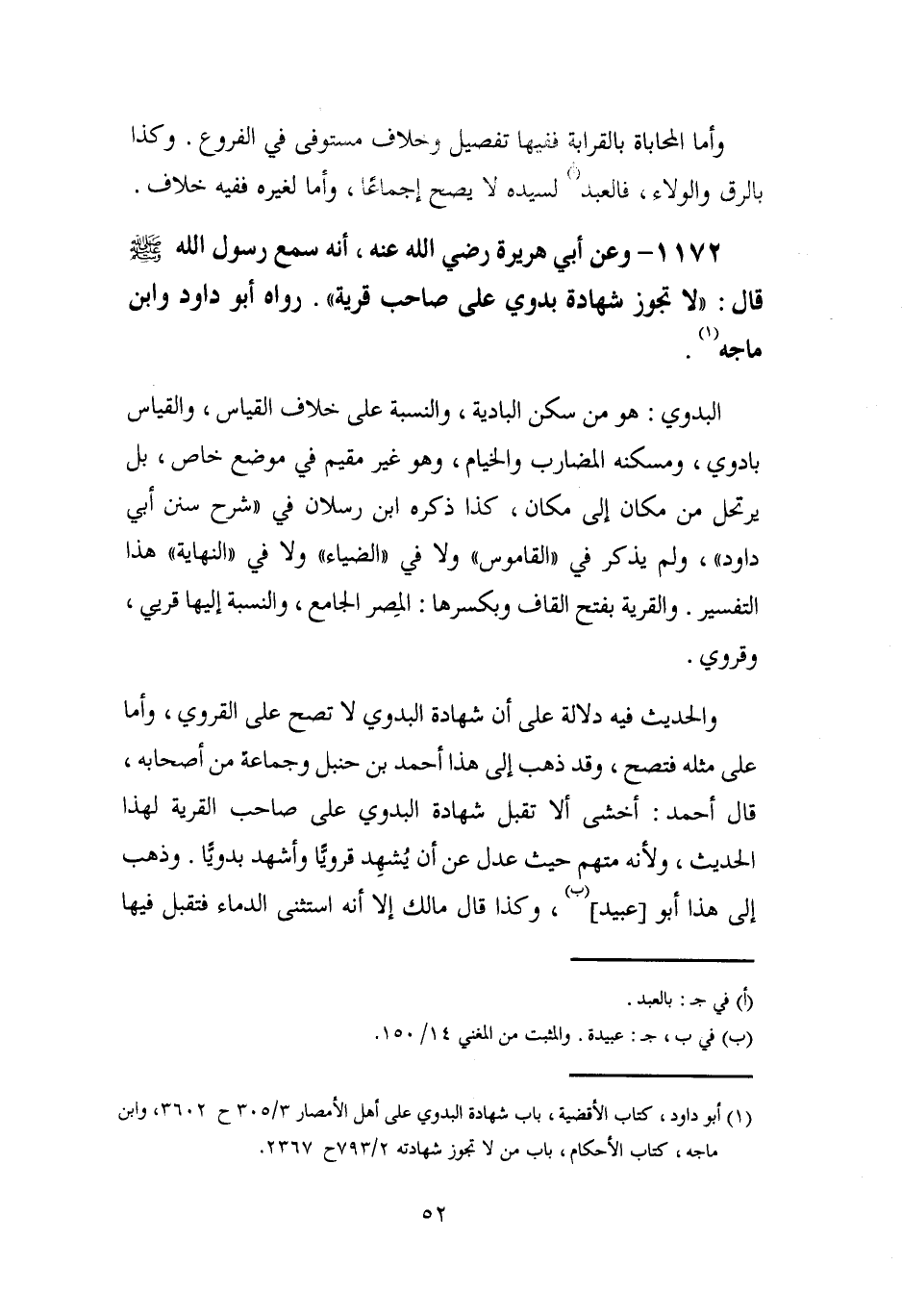 1172 - وعن أبي هريرة رضي الله عنه، أنه سمع رسول الله - صلى الله عليه وسلم - قال: "لا تجوز شهادة بدوي على صاحب قرية". رواه أبو داود وابن ماجه (¬1).