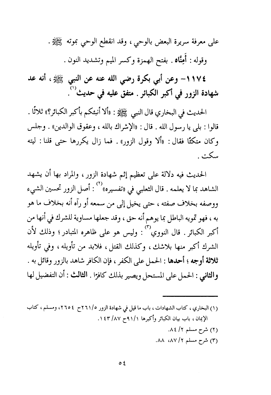 (¬1) البخاري، كتاب الشهادات، باب ما قيل في شهادة الزور 5/ 261 ح 2654، ومسلم، كتاب الإيمان، باب بيان الكبائر وأكبرها 1/ 91 ح 87/ 143.
