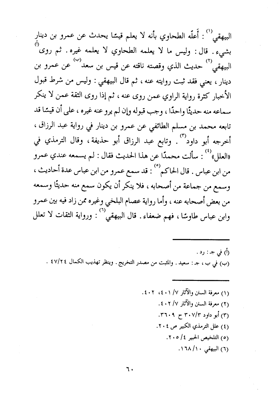 البيهقي (¬1): أَعلّه الطحاوي بأنه لا يعلم قيسًا يحدث عن عمرو بن دينار بشيء. قال: وليس ما لا يعلمه الطحاوي لا يعلمه غيره. ثم روى (أ) البيهقي (¬2) حديث الذي وقصته ناقته عن قيس بن سعد (ب) عن عمرو بن دينار، يعني فقد ثبت روايته عنه، ثم قال البيهقي: وليس من شرط قبول الأخبار كثرة رواية الراوي عمن روى عنه، ثم إذا روى الثقة عمن لا ينكر سماعه منه حديثًا واحدًا، وجب قبوله وإن لم يرو عنه غيره، على أن قيسًا قد تابعه محمد بن مسلم الطائفي عن عمرو بن دينار في رواية عبد الرزاق، أخرجه أبو داود (¬3). وتابع عبد الرزاق أبو حذيفة، وقال الترمذي في "العلل" (¬4): سألت محمدًا عن هذا الحديث فقال: لم يسمعه عندي عمرو من ابن عباس. قال الحاكم (¬5): قد سمع عمرو من ابن عباس عدة أحاديث، وسمع من جماعة من أصحابه، فلا ينكر أن يكون سمع منه حديثًا وسمعه من بعض أصحابه عنه، وأما رواية عصام البلخي وغيره ممن زاد فيه بين عمرو وابن عباس طاوسًا، فهم ضعفاء. قال البيهقي (¬6): ورواية الثقات لا تعلل