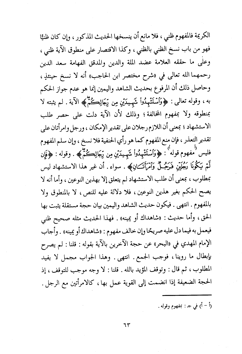 الكريمة فالمفهوم ظني، فلا مانع أن ينسخها الحديث المذكور، وإن كان ظنيًّا فهو من باب نسخ الظني بالظني، وكذا الاقتصار على منطوق الآية ظني، وعلى ما حققه العلامة عضد الملة والدين والمدقق الفهامة سعد الدين رحمهما الله تعالى في "شرح مختصر ابن الحاجب" أنه لا نسخ حينئذٍ، وحاصل ذلك أن المرفوع بحديث الشاهد واليمين إنما هو عدم جواز الحكم به، وقوله تعالى: {وَاسْتَشْهِدُوا شَهِيدَيْنِ مِنْ رِجَالِكُمْ} الآية. لم يثبته لا بمنطوقه ولا بمفهوم المخالفة؛ وذلك لأن الآية دلت على حصر طلب الاستشهاد؛ بمعنى أن اللازم رجلان على تقدير الإمكان، ورجل وامرأتان على تقدير التعذر، فإن منع المفهوم كما هو رأي الحنفية فلا نسخ، وإن سلم المفهوم فليس (أمفهوم قوله أ): {وَاسْتَشْهِدُوا شَهِيدَيْنِ مِنْ رِجَالِكُمْ}. وقوله: {فَإِنْ لَمْ يَكُونَا رَجُلَيْنِ فَرَجُلٌ وَامْرَأَتَانِ}. سواء. أن غير هذا الاستشهاد ليس بمطلوب، بمعنى أن طلب الاستشهاد لم يتعلق إلا بهذين النوعين، وأما أنه لا يصح الحكم بغير هذين النوعين، فلا دلالة عليه للنص، لا بالمنطوق ولا بالمفهوم. انتهى. فيكون حديث الشاهد واليمين بيان حجة مستقلة يثبت بها الحق، وأما حديث: "شاهداك أو يمينه". فهذا الحديث مثله صحيح ظني فيعمل به فيما دل عليه صريحًا وإن خالف مفهوم: "شاهداك أو يمينه". وأجاب الإمام المهدي في "البحر" عن حجة الآخرين بالآية بقوله: قلنا: لم يصرح بإبطال ما روينا، فوجب الجمع. انتهى. وهذا الجواب مجمل لا يفيد المطلوب، ثم قال: وتوقف المؤيد بالله. قلنا: لا وجه موجب للتوقف، إذ الحجة الضعيفة إذا انضمت إلى القوية عمل بها، كالامرأتين مع الرجل.