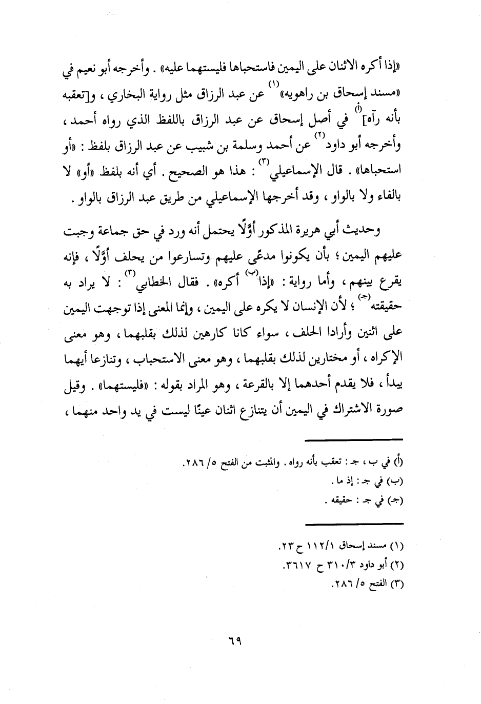 "إذا أكره الاثنان على اليمين فاستحباها فليستهما عليه". وأخرجه أبو نعيم في "مسند إسحاق بن راهويه" (¬1) عن عبد الرزاق مثل رواية البخاري، و [تعقبه بأنه رآه] (أ) في أصل إسحاق عن عبد الرزاق باللفظ الذي رواه أحمد، وأخرجه أبو داود (¬2) عن أحمد وسلمة بن شبيب عن عبد الرزاق بلفظ: "أو استحباها". قال الإسماعيلي (¬3): هذا هو الصحيح. أي أنه بلفظ "أو" لا بالفاء ولا بالواو، وقد أخرجها الإسماعيلي من طريق عبد الرزاق بالواو.