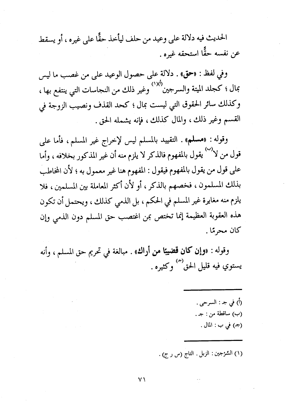 وفي لفظ: "حق". دلالة على حصول الوعيد على من غصب ما ليس بمال؛ كجلد الميتة والسرجين (أ) (¬1) وغير ذلك من النجاسات التي ينتفع بها، وكذلك سائر الحقوق التي ليست بمال؛ كحد القذف ونصيب الزوجة في القسم وغير ذلك، والمال كذلك، فإنه يشمله الحق.