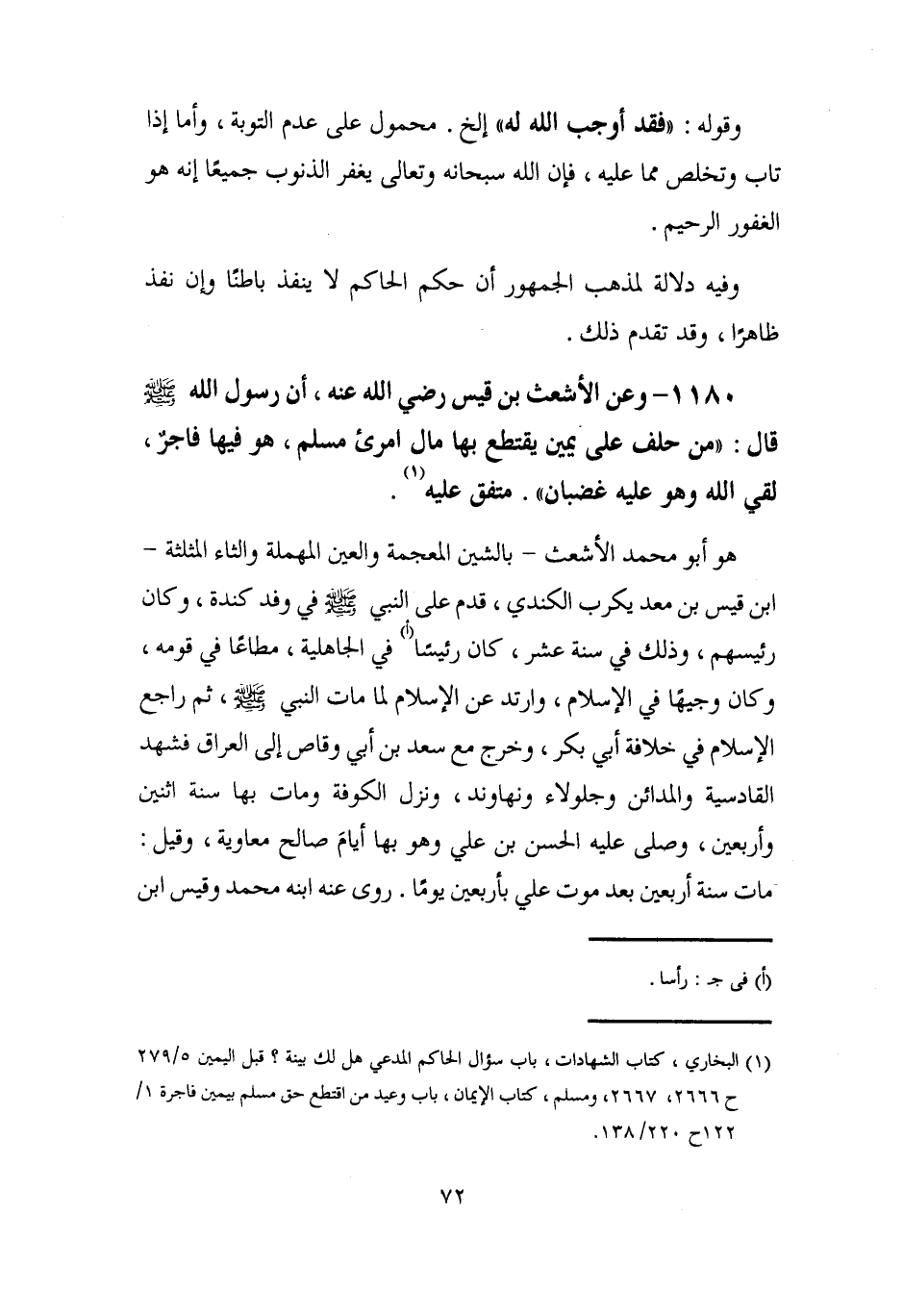 1180 - وعن الأشعث بن قيس رضي الله عنه، أن رسول الله - صلى الله عليه وسلم - قال: "من حلف على يمين يقتطع بها مال امرئ مسلم، هو فيها فاجرٌ، لقي الله وهو عليه غضبان". متفق عليه (¬1).