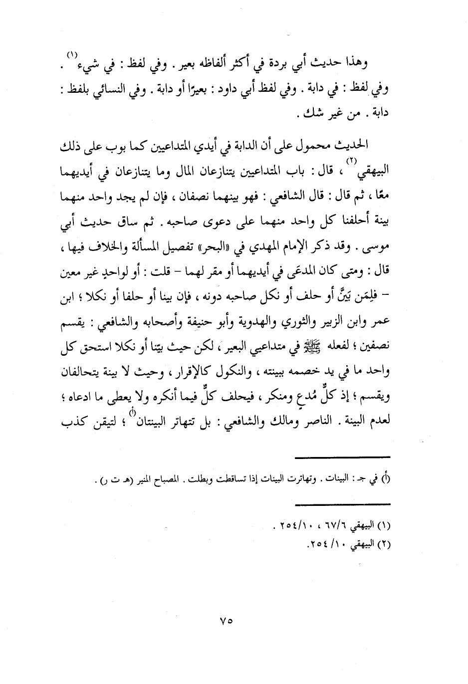 الحديث محمول على أن الدابة في أيدي المتداعيين كما بوب على ذلك البيهقي (¬2)، قال: باب المتداعيين يتنازعان المال وما يتنازعان في أيديهما معًا، ثم قال: قال الشافعي: فهو بينهما نصفان، فإن لم يجد واحد منهما بينة أحلفنا كل واحد منهما على دعوى صاحبه. ثم ساق حديث أبي موسى. وقد ذكر الإمام المهدي في "البحر" تفصيل المسألة والخلاف فيها، قال: ومتى كان المدعَى في أيديهما أو مقر لهما -قلت: أو لواحدٍ غير معين- فلِمَن بَيَّن أو حلف أو نكل صاحبه دونه، فإن بينا أو حلفا أو نكلا؛ ابن عمر وابن الزبير والثوري والهدوية وأبو حنيفة وأصحابه والشافعي: يقسم نصفين؛ لفعله - صلى الله عليه وسلم - في متداعيي البعير، لكن حيث بيّنا أو نكلا استحق كل واحد ما في يد خصمه ببينته، والنكول كالإقرار، وحيث لا بينة يتحالفان ويقسم؛ إذ كلٌّ مُدعٍ ومنكر، فيحلف كلٌّ فيما أنكره ولا يعطى ما ادعاه؛ لعدم البينة. الناصر ومالك والشافعي: بل تتهاتر البينتان (أ)؛ لتيقن كذب