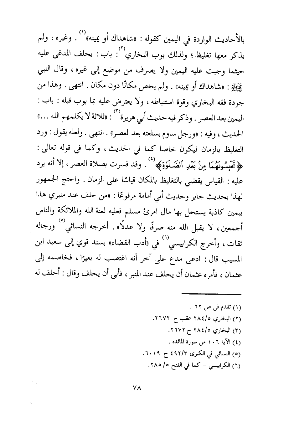 بالأحاديث الواردة في اليمين كقوله: "شاهداك أو يمينه" (¬1). وغيره، ولم يذكر معها تغليظ؛ ولذلك بوب البخاري (¬2): باب: يحلف المدعَى عليه حيثما وجبت عليه اليمين ولا يصرف من موضع إلى غيره، وقال النبي - صلى الله عليه وسلم -: "شاهداك أو يمينه". ولم يخص مكانًا دون مكان. انتهى. وهذا من جودة فقه البخاري وقوة استنباطه، ولا يعترض عليه بما بوب قبله: باب: اليمين بعد العصر. وذكر فيه حديث أبي هريرة (¬3): "ثلاثة لا يكلمهم الله ... " الحديث، وفيه: "ورجل ساوم بسلعته بعد العصر". انتهى. ولعله يقول: ورد التغليظ بالزمان فيكون خاصا كما في الحديث، وكما في قوله تعالى: {تَحْبِسُونَهُمَا مِنْ بَعْدِ الصَّلَاةِ} (¬4). وقد فسرت بصلاة العصر، إلا أنه يرد عليه: القياس يقضي بالتغليظ بالكان قياسًا على الزمان. واحتج الجمهور لهذا بحديث جابر وحديث أبي أمامة مرفوعًا: "من حلف عند منبري هذا بيمين كاذبة يستحل بها مال امرئ مسلم فعليه لعنة الله والملائكة والناس أجمعين، لا يقبل الله منه صرفًا ولا عدلًا". أخرجه النسائي (¬5) ورجاله ثقات، وأخرج الكرابيسي (¬6) في "أدب القضاء" بسند قوي إلى سعيد ابن المسيب قال: ادعى مدع على آخر أنه اغتصب له بعيرًا، فخاصمه إلى عثمان، فأمره عثمان أن يحلف عند المنبر، فأبى أن يحلف وقال: أحلف له