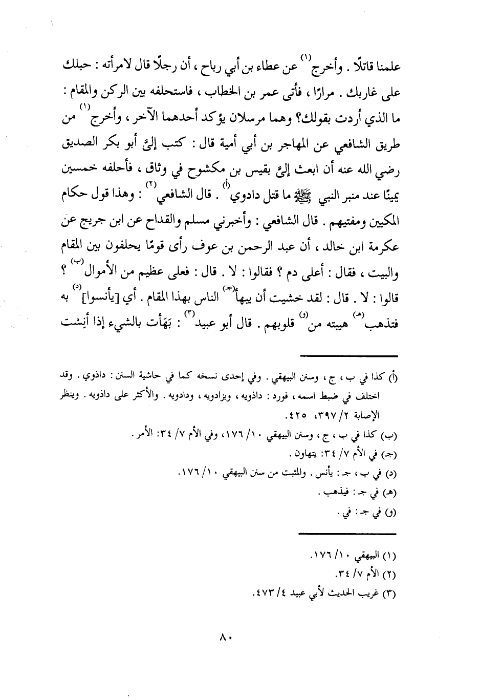 علمنا قاتلًا. وأخرج (¬1) عن عطاء بن أبي رباح، أن رجلًا قال لامرأته: حبلك على غاربك. مرارًا، فأتى عمر بن الخطاب، فاستحلفه بين الركن والمقام: ما الذي أردت بقولك؟ وهما مرسلان يؤكد أحدهما الآخر، وأخرج (1) من طريق الشافعي عن المهاجر بن أبي أمية قال: كتب إليَّ أبو بكر الصديق رضي الله عنه أن ابعث إليّ بقيس بن مكشوح في وثاق، فأحلفه خمسين يمينا عند منبر النبي - صلى الله عليه وسلم - ما قتل دادوي (أ). قال الشافعي (¬2): وهذا قول حكام المكيين ومفتيهم. قال الشافعي: وأخبرني مسلم والقداح عن ابن جريج عن عكرمة ابن خالد، أن عبد الرحمن بن عوف رأى قوما يحلفون بين المقام والبيت، فقال: أعلى دم؟ فقالوا: لا. قال: فعلى عظيم من الأموال (ب)؟ قالوا: لا. قال: لقد خشيت أن يبهأ (جـ) الناس بهذا المقام. أي [يأنسوا] (د) به فتذهب (هـ) هيبته من (و) قلوبهم. قال أبو عبيد (¬3): بَهَأت بالشيء إذا أنِسْت