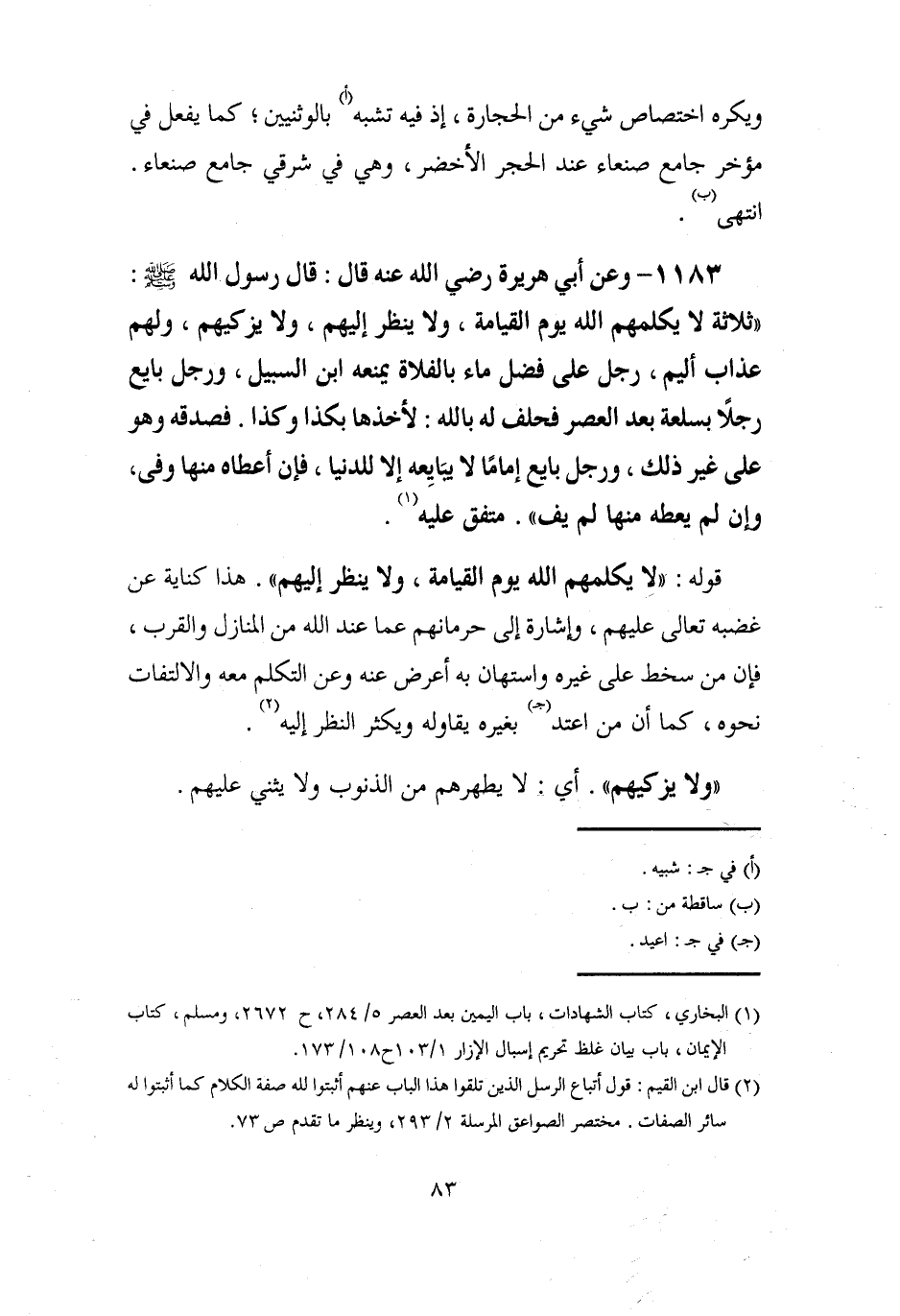 (¬1) البخاري، كتاب الشهادات، باب اليمين بعد العصر 5/ 284، ح 2672، ومسلم، كتاب الإيمان، باب بيان غلظ تحريم إسبال الإزار 1/ 103 ح 108/ 173.