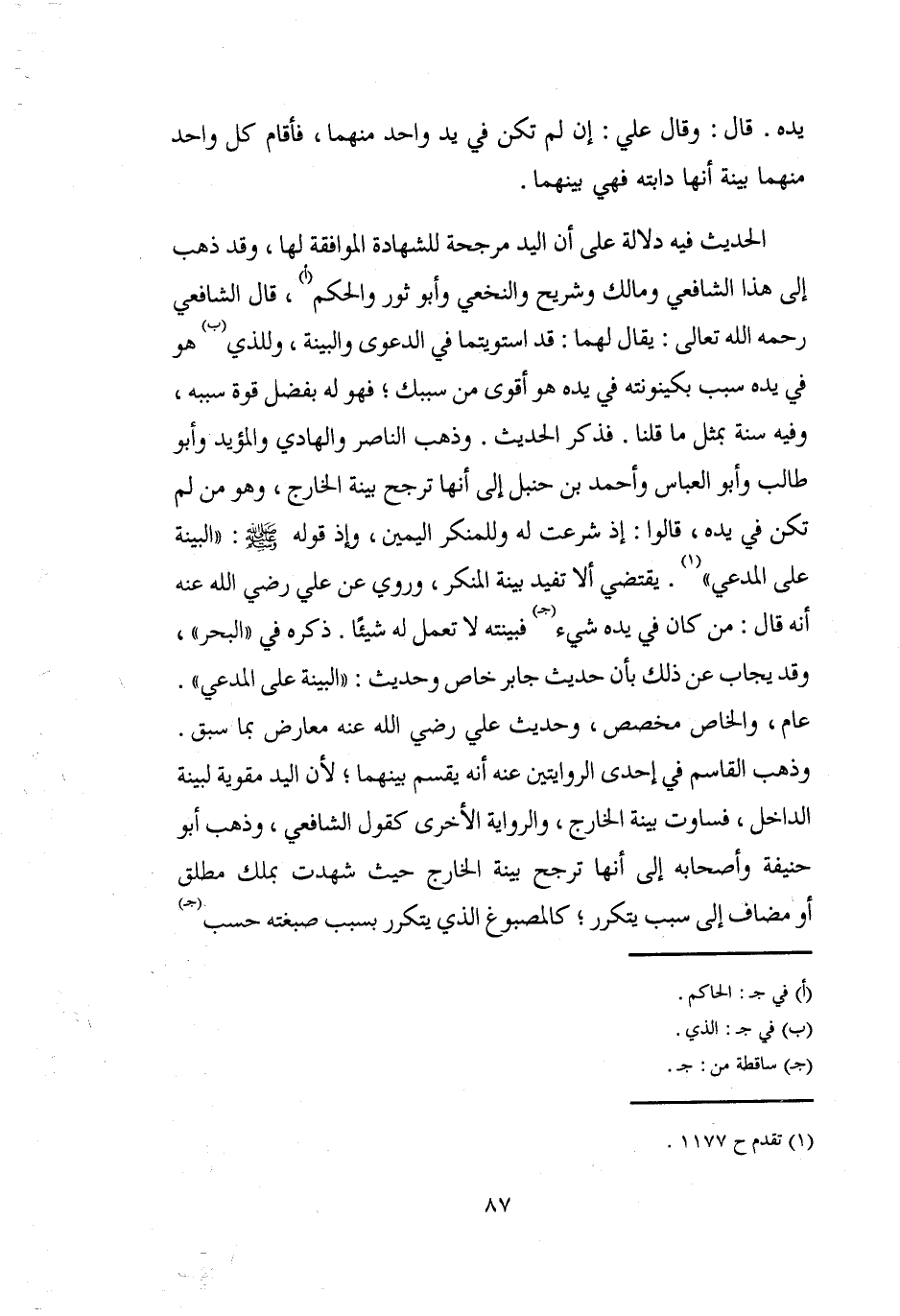 الحديث فيه دلالة على أن اليد مرجحة للشهادة الموافقة لها، وقد ذهب إلى هذا الشافعي ومالك وشريح والنخعي وأبو ثور والحكم (أ)، قال الشافعي رحمه الله تعالى: يقال لهما: قد استويتما في الدعوى والبينة، وللذي (ب) هو في يده سبب بكينونته في يده هو أقوى من سببك؛ فهو له بفضل قوة سببه، وفيه سنة بمثل ما قلنا. فذكر الحديث. وذهب الناصر والهادي والمؤيد وأبو طالب وأبو العباس وأحمد بن حنبل إلى أنها ترجح بينة الخارج، وهو من لم تكن في يده، قالوا: إذ شرعت له وللمنكر اليمين، وإذ قوله - صلى الله عليه وسلم -: "البينة على المدعي" (¬1). يقتضي ألا تفيد بينة المنكر، وروي عن علي رضي الله عنه أنه قال: من كان في يده شيء (جـ) فبينته لا تعمل له شيئًا. ذكره في "البحر"، وقد يجاب عن ذلك بأن حديث جابر خاص وحديث: "البينة على المدعي". عام، والخاص مخصص، وحديث علي رضي الله عنه معارض بما سبق. وذهب القاسم في إحدى الروايتين عنه أنه يقسم بينهما؛ لأن اليد مقوية لبينة الداخل، فساوت بينة الخارج، والرواية الأخرى كقول الشافعي، وذهب أبو حنيفة وأصحابه إلى أنها ترجح بينة الخارج حيث شهدت بملك مطلق أو مضاف إلى سبب يتكرر؛ كالمصبوغ الذي يتكرر بسبب صبغته حسب (جـ)
