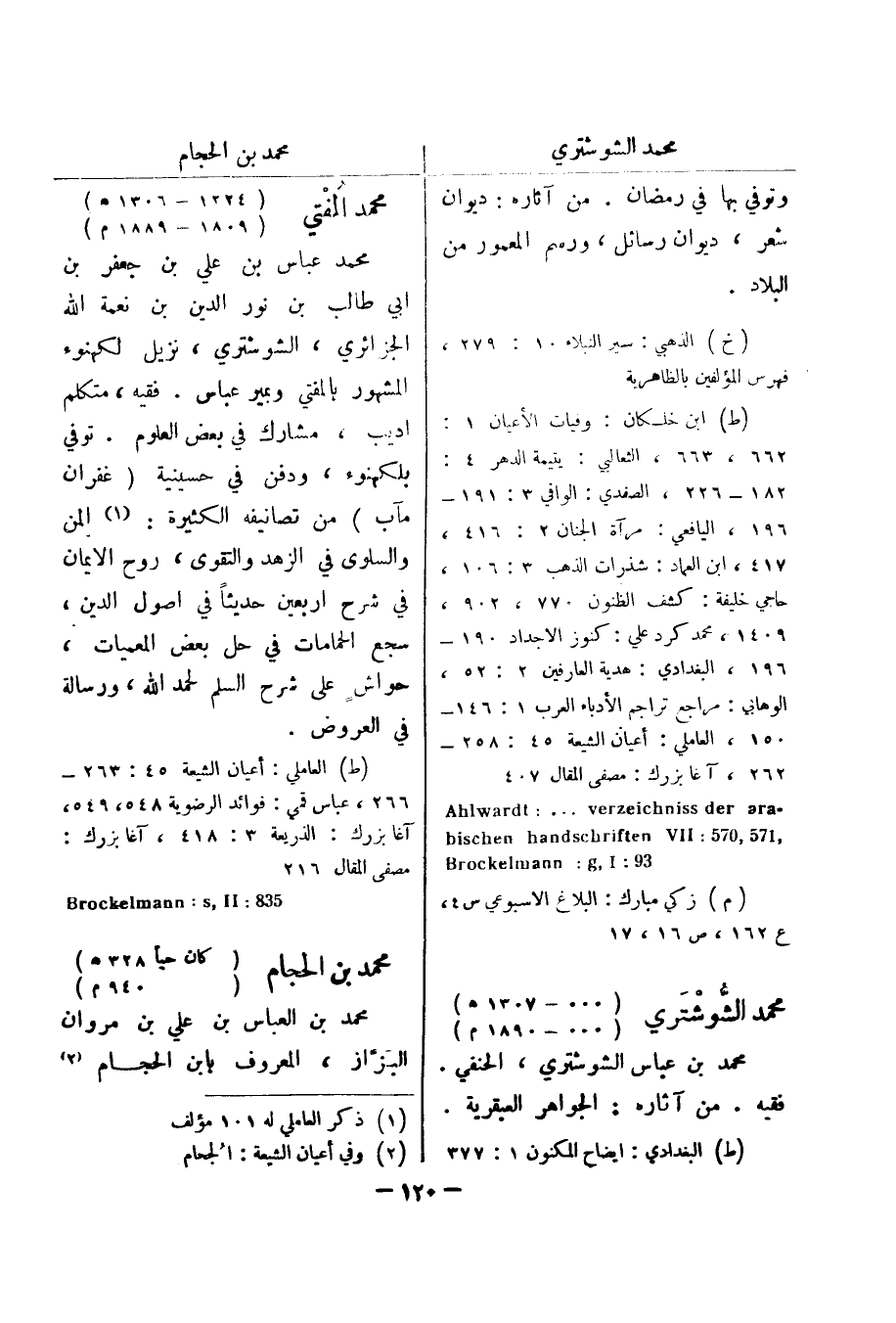 196، اليافعي: مرآة الجنان 2: 416، 417، ابن العماد: شذرات الذهب 3: 106، حاجي خليفة: كشف الظنون 770، 902، 1409، محمد كرد علي: كنوز الاجداد 190 - 196، البغدادي: هدية العارفين 2: 52، الوهابي: مراجع تراجم الادباء العرب 1: 146 - 150، العاملي: أعيان الشيعة 45: 258 - 262، آغا بزرك: مصفى المقال 407 - Ahlwardt:..Verzeichniss der ara , 571 , 570: bischen handschriften Vll 93 Brockelmann: g , l (م) زكي مبارك: البلاغ الاسبوعي س 4، ع 162، ص 16، 17 محمد الشوشتري (000 - 1307 هـ) (000 - 1890 م) محمد بن عباس الشوشتري، الحنفي.