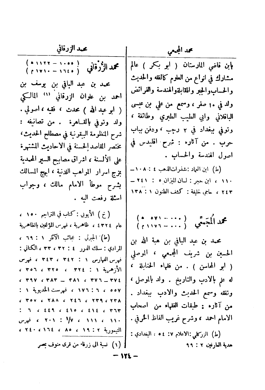 (ط) الزركلي: الاعلام 7: 54: البغدادي: هدية العارفين 2: 99 محمد الزرقاني (1055 - 1122 هـ) (1645 - 1710 م)