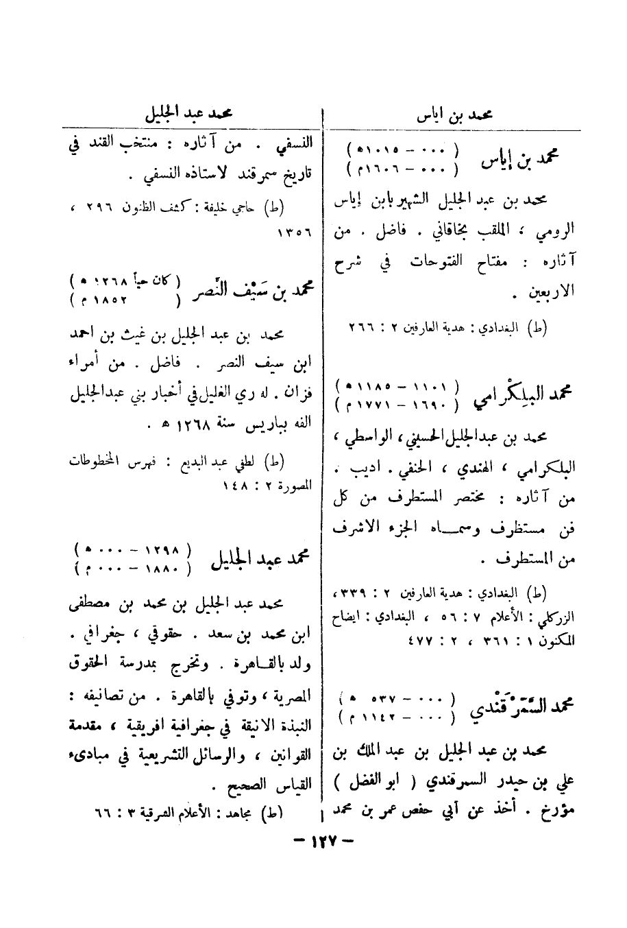 (ط) البغدادي: هدية العارفين 2: 339، الزركلي: الاعلام 7: 56، البغدادي: ايضاح المكنون 1: 361، 2: 477 محمد السمرقندي (000 - 537 هـ) (000 - 1142 م) محمد بن عبد الجليل بن عبد الملك بن علي بن حيدر السمرقندي (أبو الفضل) مؤرخ.