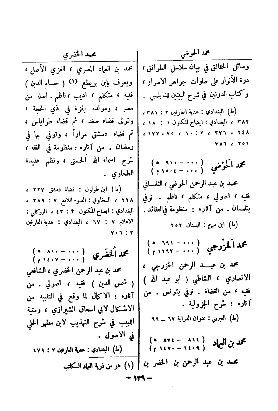 (ط) ابن طولون: قضاة دمشق 227، 228، السخاوي: الضوء اللامع 7: 289، البغدادي: ايضاح المكنون 2: 43، الزركلي: الاعلام 7: 67، البغدادي: هدية العارفين 2: 206 محمد الخضري (000 - 810 هـ) (000 - 1407 م) محمد بن عبد الرحمن الخضري، الشافعي (شمس الدين) فقيه، اصولي.