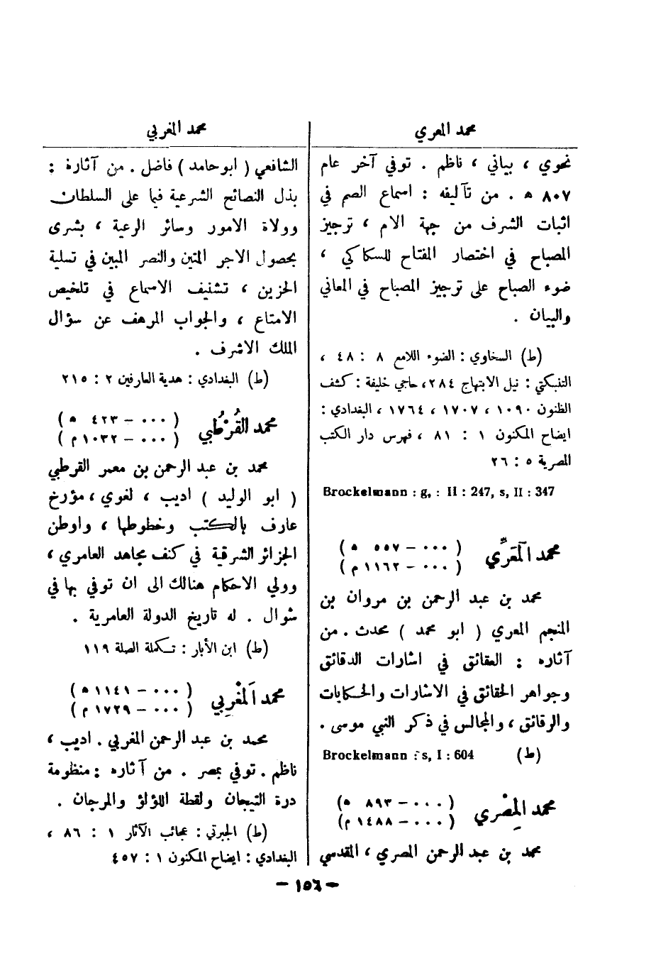 (ط) 604: Brockelmann: s , l محمد المصري (000 - 893 هـ) (000 - 1488 م) محمد بن عبد الرحمن المصري، المقدسي الشافعي (أبو حامد) فاضل من آثاره، بذل النصائح الشرعية فيما على السلطان وولاة الامور وسائر الرعية، بشرى بحصول الاجر المتين والنصر المبين في تسلية الحزين، تشنيف الاسماع في تلخيص الامتاع، والجواب المرهف عن سؤال الملك الاشرف.