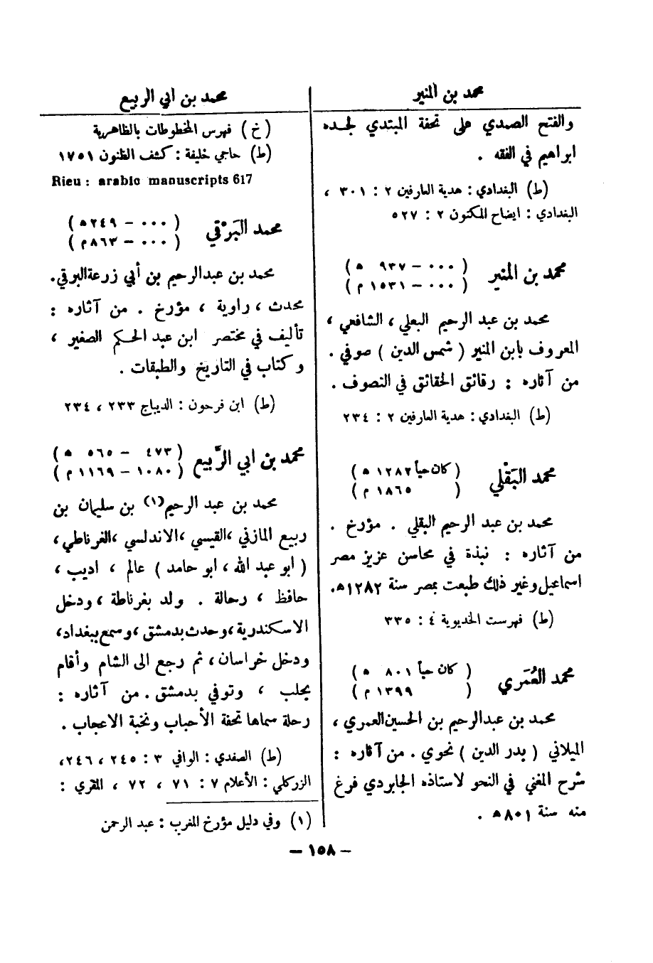 (خ) فهرس المخطوطات بالظاهرية (ط) حاجي خليفة: كشف الظنون 1751 617 Rieu: arabic manuscripts محمد البرقي (000 - 249 هـ) (000 - 863 م) محمد بن عبد الرحيم بن أبي زرعة البرقي.