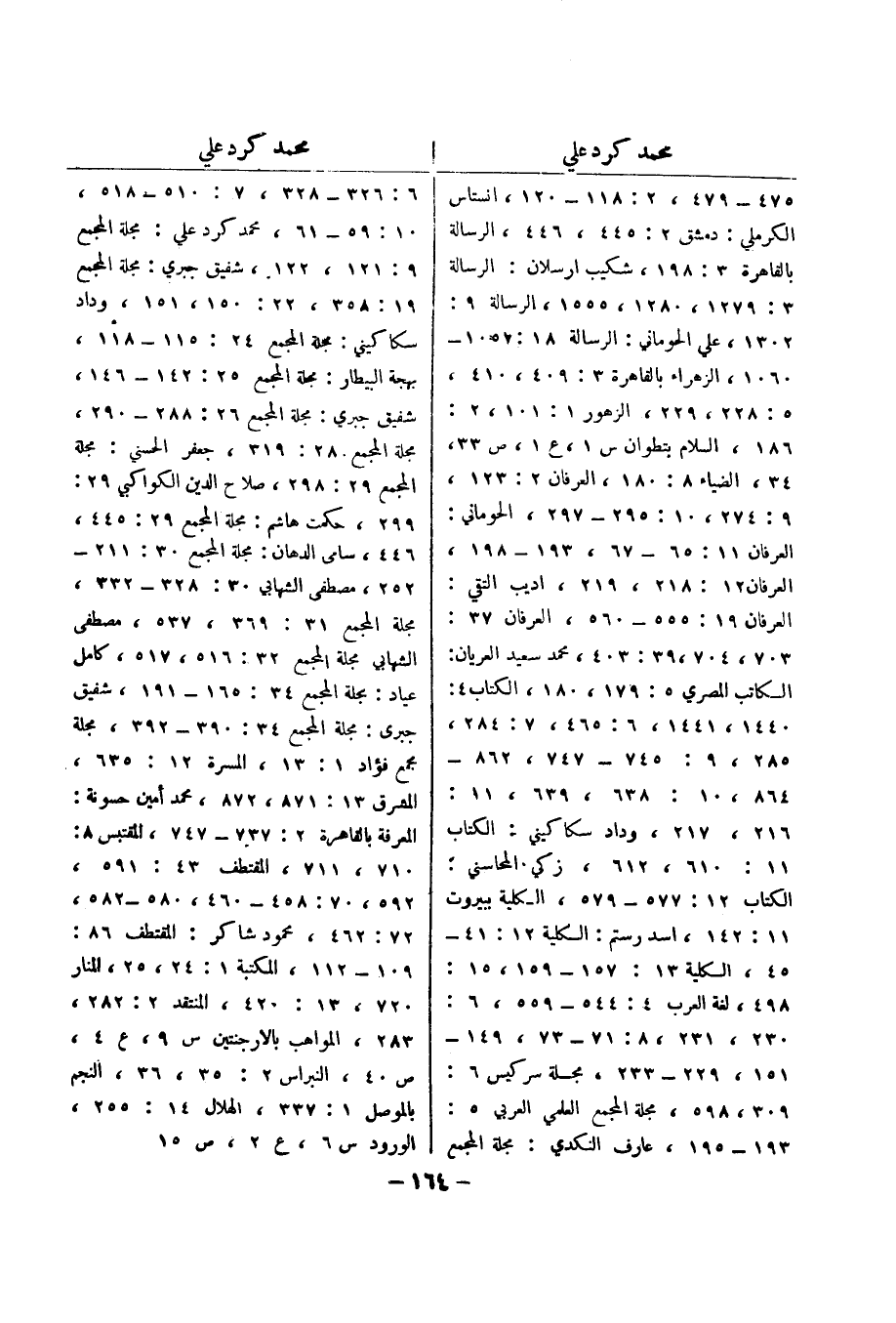 703، 704، 39: 403، محمد سعيد العريان: الكاتب المصري 5: 179، 180، الكتاب 4: 1440، 1441، 6: 465، 7: 284، 285، 9: 745 - 747، 862 - 864، 10: 638، 639، 11: 216، 217، وداد سكاكيني: الكتاب 11: 610، 612، زكي المحاسني: الكتاب 12: 577 - 579، الكلية ببيروت 11: 142، اسد رستم: الكلية 12: 41 - 45، الكلية 13: 157 - 159، 15: 498، لغة العرب 4: 544 - 559، 6: 230، 231، 8: 71 - 73، 149 - 151، 229 - 233، مجلة سركيس 6: 309، 598، مجلة المجمع العلمي العربي 5: 193 - 195، عارف النكدي: مجلة المجمع 6: 326 - 328، 7: 510 - 518، 10: 59 - 61، محمد كرد علي: مجلة المجمع 9: 121، 122، شفيق جبري: مجلة المجمع 19: 358، 22: 150، 151، وداد سكاكيني: مجلة المجمع 24: 115 - 118، بهجة البيطار: مجلة المجمع 25: 142 - 146، شفيق جبري: مجلة المجمع 26: 288 - 290،