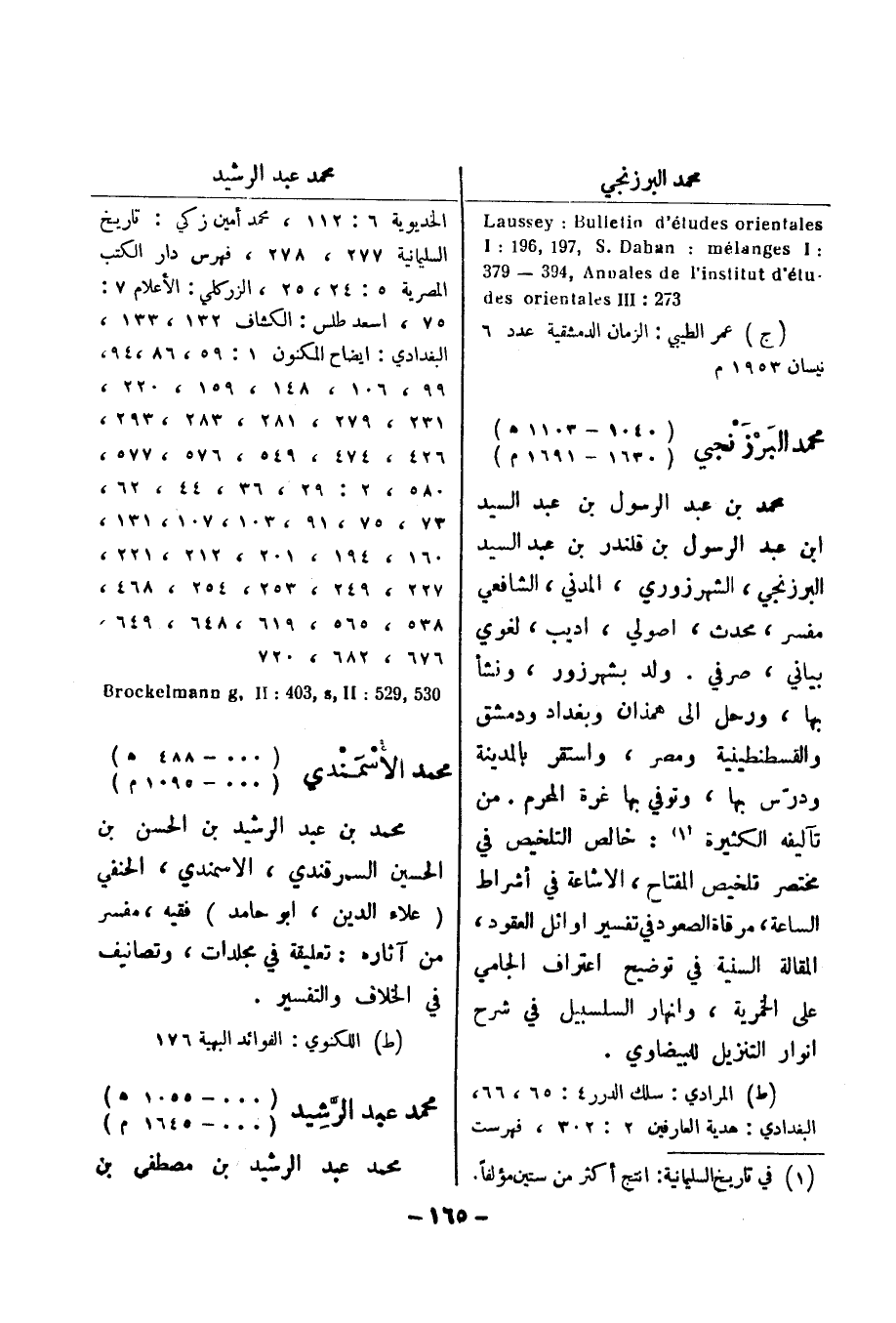 Dahan: melanges l 973 - 493 , Annales de l ' institut d ' etu 273: des orientales lll (ج) عمر الطيبي: الزمان الدمشقية عدد 6 نيسان 1953 م محمد البرزنجي (1040 - 1103 هـ) (1630 - 1691 م) محمد بن عبد الرسول بن عبد السيد ابن عبد الرسول بن قلندر بن عبد السيد البرزنجي، الشهرزوري، المدني، الشافعي مفسر، محدث، اصولي، اديب، لغوي بياني، صرفي.