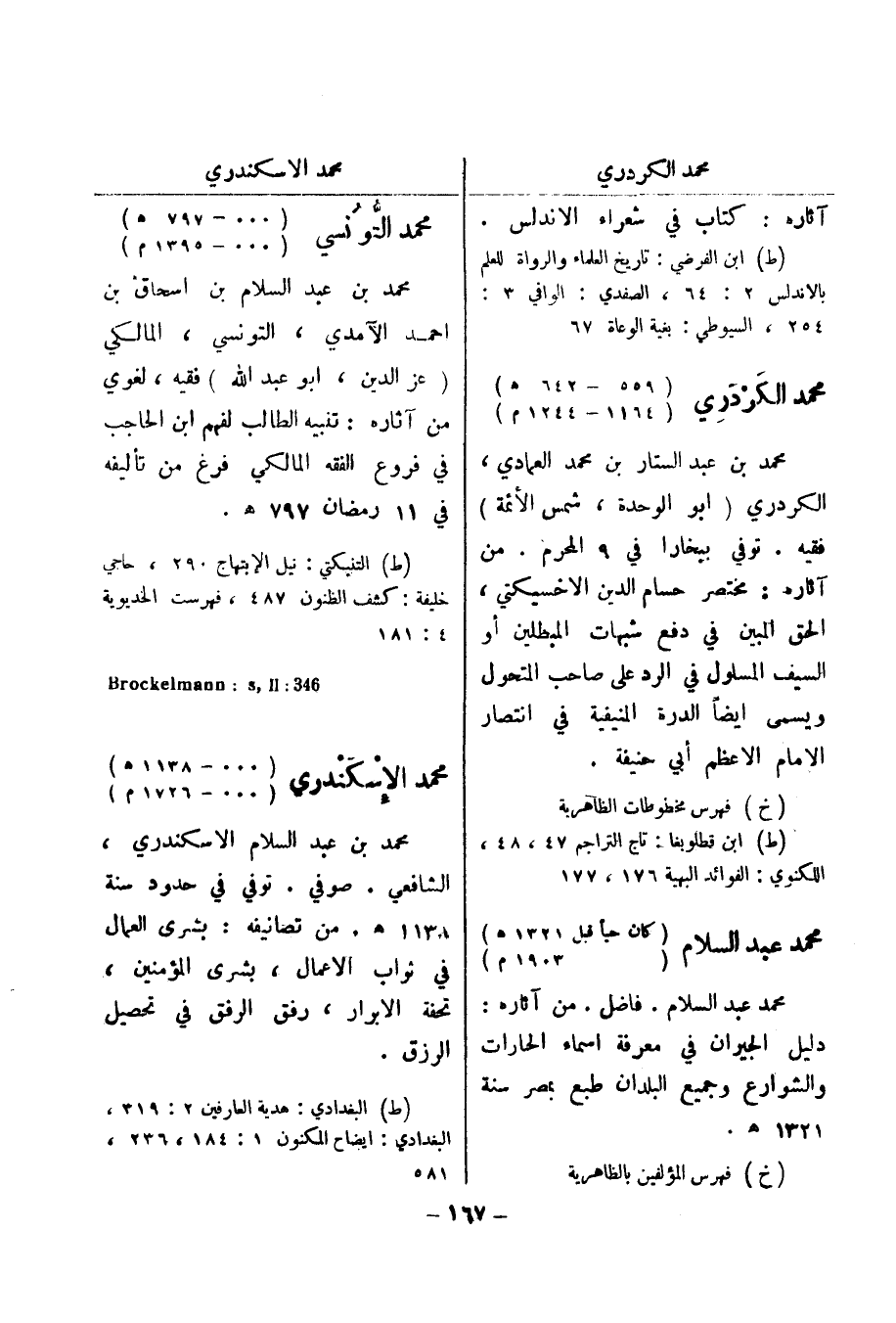 (ط) التنبكتي: نيل الابتهاج 290، حاجي خليفة: كشف الظنون 287، فهرست الخديوية 4: 181 346: Brockelmann: s , ll محمد الاسكندري (000 - 1138 هـ) (000 - 1726 م) محمد بن عبد السلام الاسكندري، الشافعي.