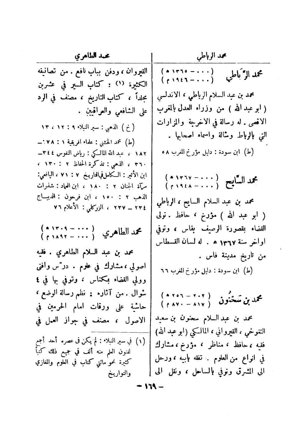 (خ) الذهبي: سير النبلاء 9: 12، 13 (ط) محمد الخشني: علماء افريقية 1: 178 - 182، عبد الله المالكي: رياض النفوس 344 - 360، الذهبي: تذكرة الحفاظ 2: 130، ابن الاثير: الكامل في التاريخ 7: 71، اليافعي: مرآة الجنان 2: 180، ابن العماد: شذرات الذهب 2: 150، ابن فرحون: الديباج 234 - 237، الزركلي: الاعلام 76 محمد الطاهري (000 - 1309 هـ) (000 - 1892 م) محمد بن عبد السلام الطاهري.