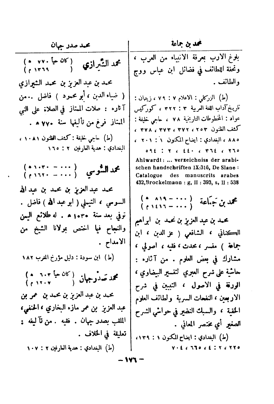 (ط) البغدادي: ايضاح المكنون 1: 139، 225، 2: 4، 665، 704 محمد الشيرازي (كان حيا 770 هـ) (1369 م) محمد بن عبد العزيز بن محمد الشيرازي (ضياء الدين، أبو محمود) فاضل.