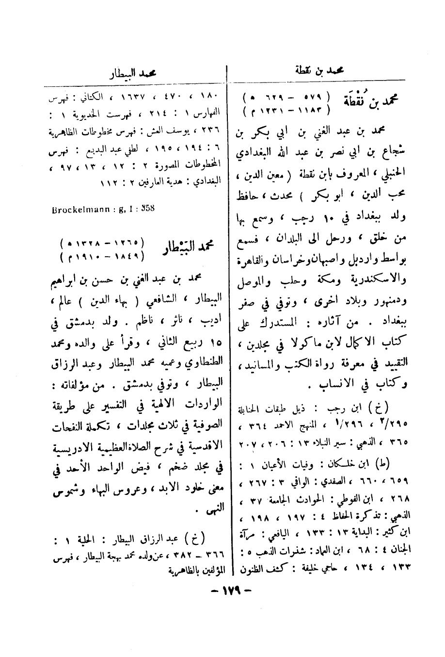 133، 134، حاجي خليفة: كشف الظنون 180، 470، 1637، الكتاني: فهرس الفهارس 1: 214، فهرست الخديوية 1: 236، يوسف العش: فهرس مخطوطات الظاهرية 6: 194، 195، لطفي عبد البديع: فهرس المخطوطات المصورة 2: 12، 13، 97، البغدادي: هدية العارفين 2: 112 358: Brockelmann: g , l محمد البيطار (1265 - 1328 هـ) (1849 - 1910 م) محمد بن عبد الغني بن حسن بن ابراهيم البيطار، الشافعي (بهاء الدين) عالم، اديب، ناثر، ناظم.