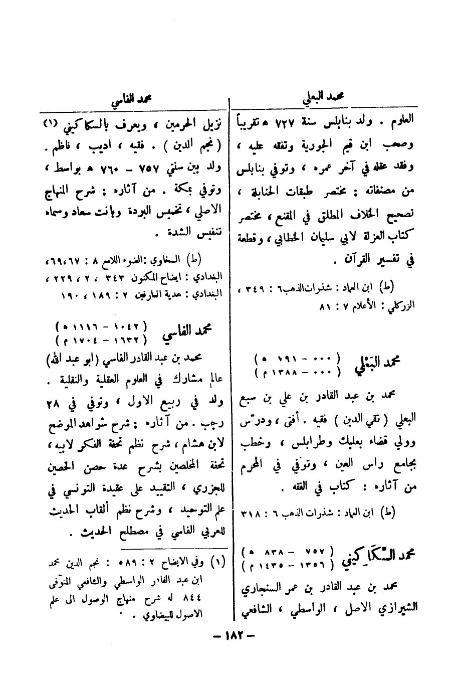 (ط) ابن العماد: شذرات الذهب 6: 318 محمد السكاكيني (757 - 838 هـ) (1356 - 1435 م) محمد بن عبد القادر بن عمر السنجاري الشيرازي الاصل، الواسطي، الشافعي نزيل الحرمين، ويعرف بالسكاكيني (1) (نجم الدين) .