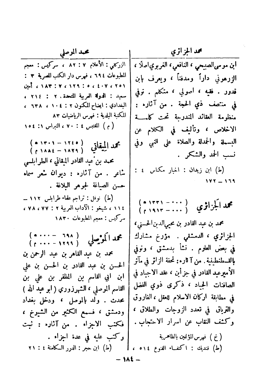 (ط) ابن زيدان: اخبار مكناس 4: 169 - 172 محمد الجزائري (000 - 1331 هـ) (000 - 1913 م) محمد بن عبد القادر بن محيي الدين الحسني، الجزائري، الدمشقي.