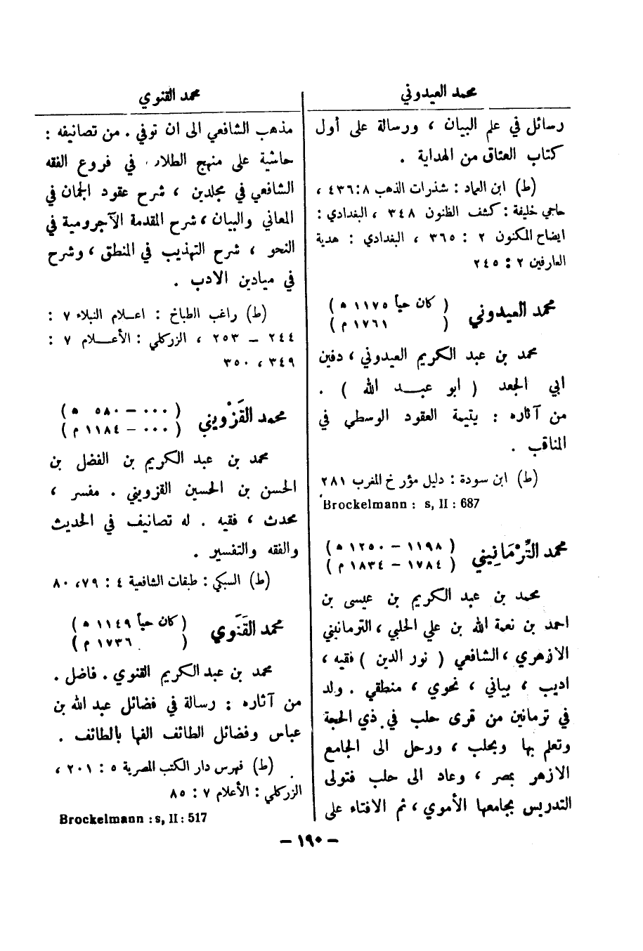(ط) السبكي: طبقات الشافعية 4: 79، 80 محمد القنوي (كان حيا 1149 هـ) (1736 م) محمد بن عبد الكريم القنوي.