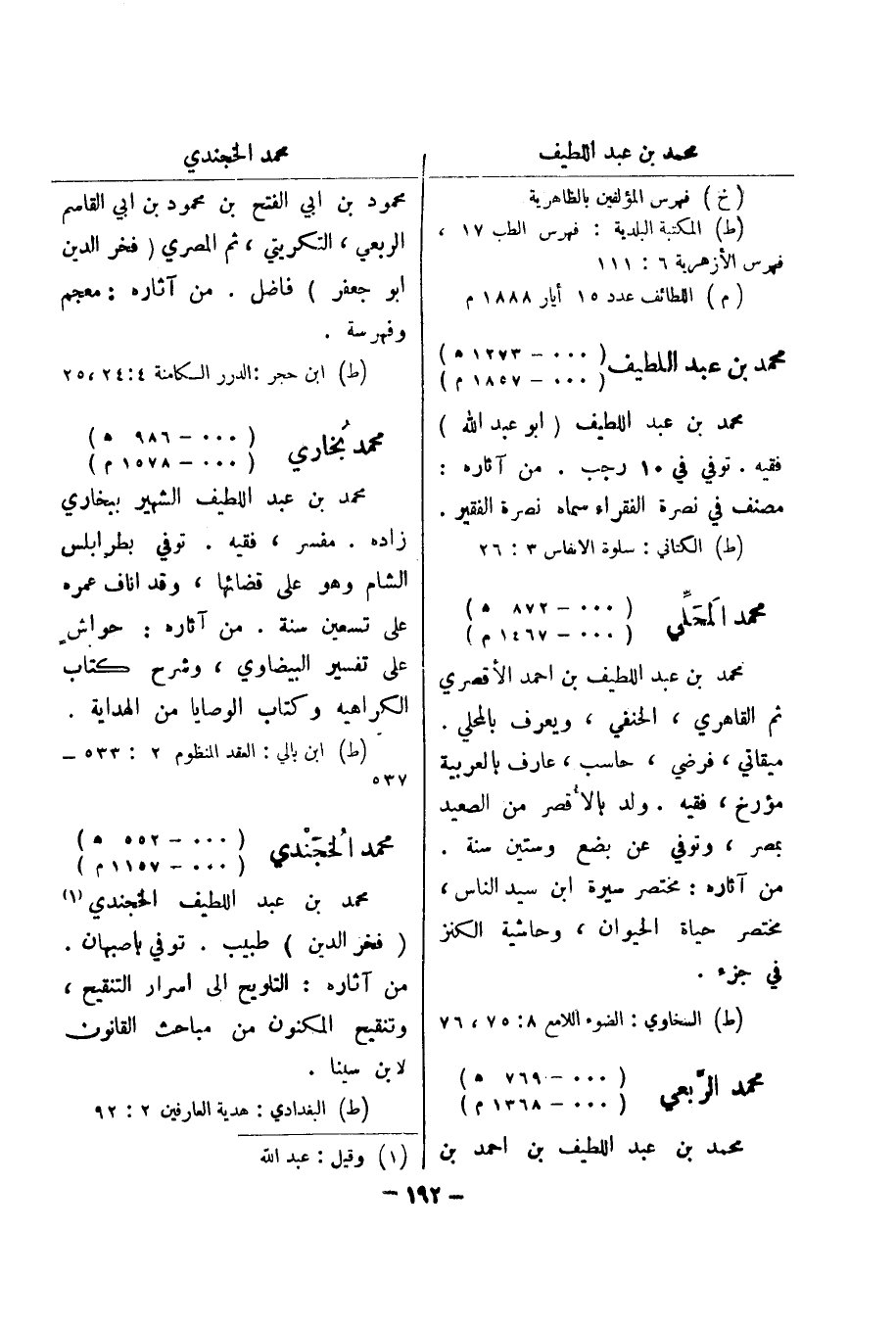 (خ) فهرس المؤلفين بالظاهرية (ط) المكتبة البلدية: فهرس الطب 17، فهرس الازهرية 6: 111 (م) اللطائف عدد 15 أيار 1888 م محمد بن عبد اللطيف (000 - 1273 هـ) (000 - 1857 م) محمد بن عبد اللطيف (أبو عبد الله) فقيه.