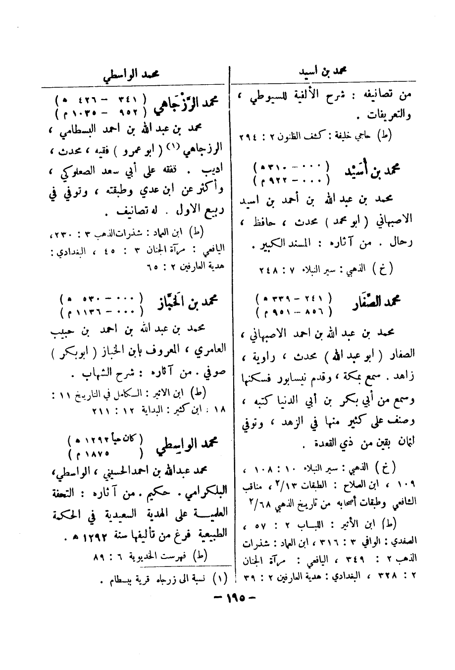 (ط) حاجي خليفة: كشف الظنون 2: 294 محمد بن أسيد (000 - 310 هـ) (000 - 922 م) محمد بن عبد الله بن أحمد بن اسيد الاصبهاني (أبو محمد) محدث، حافظ، رحال.