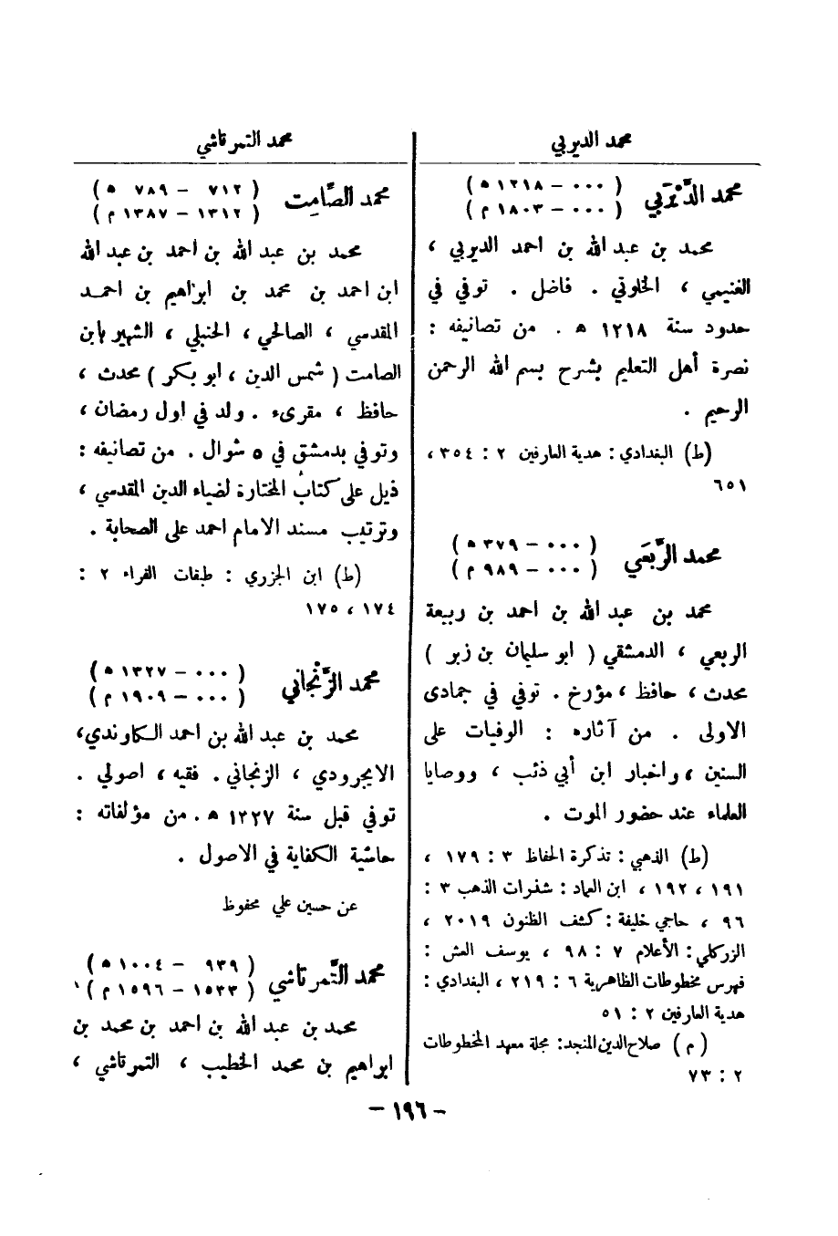 (ط) الذهبي: تذكرة الحفاظ 3: 179، 191، 192، ابن العماد: شذرات الذهب 3: 96، حاجي خليفة: كشف الظنون 2019، الزركلي: الاعلام 7: 98، يوسف العش: فهرس مخطوطات الظاهرية 6: 219، البغدادي: هدية العارفين 2: 51 (م) صلاح الدين المنجد: مجلة معهد المخطوطات 2: 73 محمد الصامت (712 - 789 هـ) (1312 - 1387 م) محمد بن عبد الله بن احمد بن عبد الله ابن احمد بن محمد بن ابراهيم بن احمد المقدسي، الصالحي، الحنبلي، الشهير بابن الصامت (شمس الدين، أبو بكر) محدث، حافظ، مقرئ.