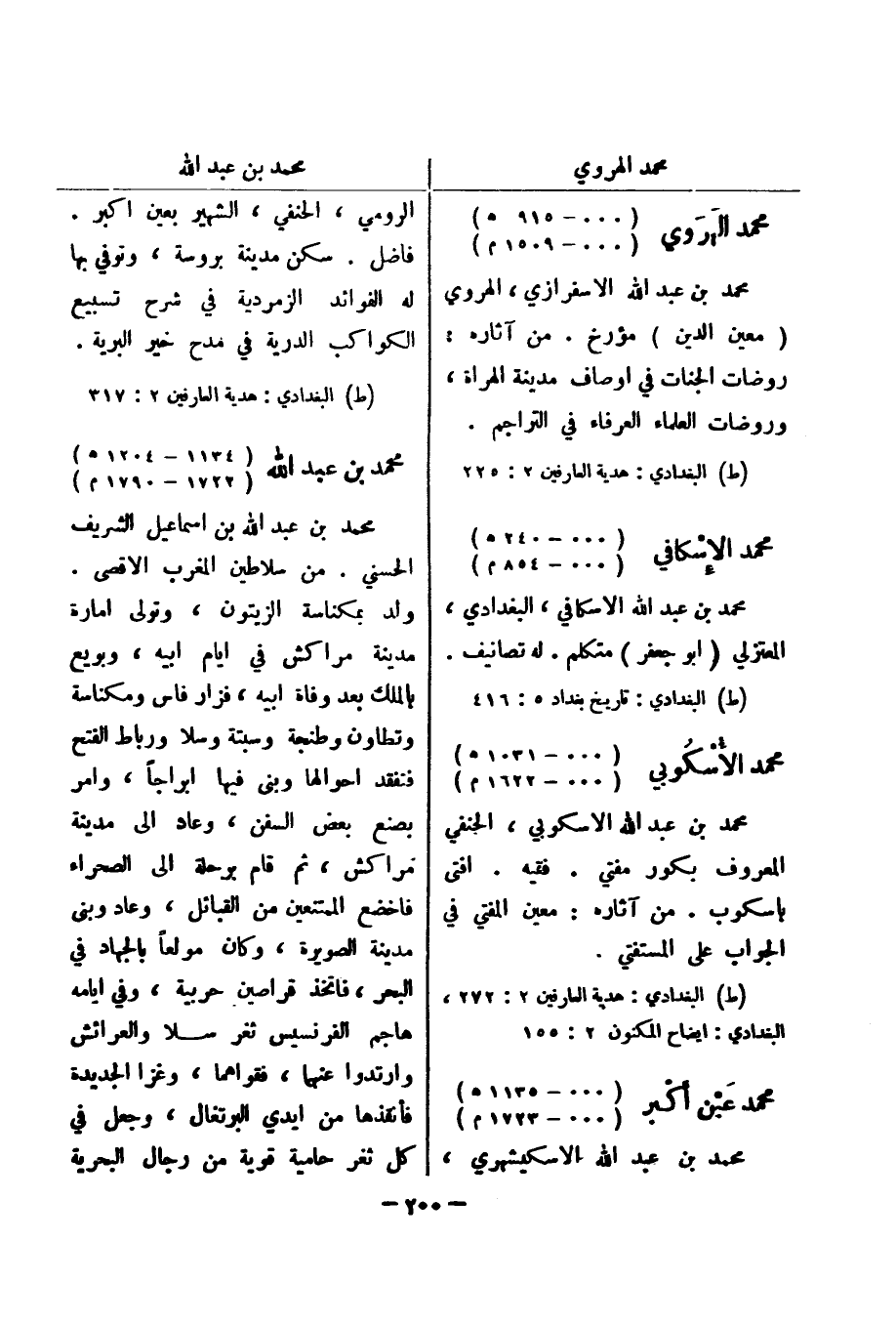 (ط) البغدادي: هدية العارفين 2: 225 محمد الاسكافي (000 - 240 هـ) (000 - 854 م) محمد بن عبد الله الاسكافي، البغدادي، المعتزلي (أبو جعفر) متكلم.