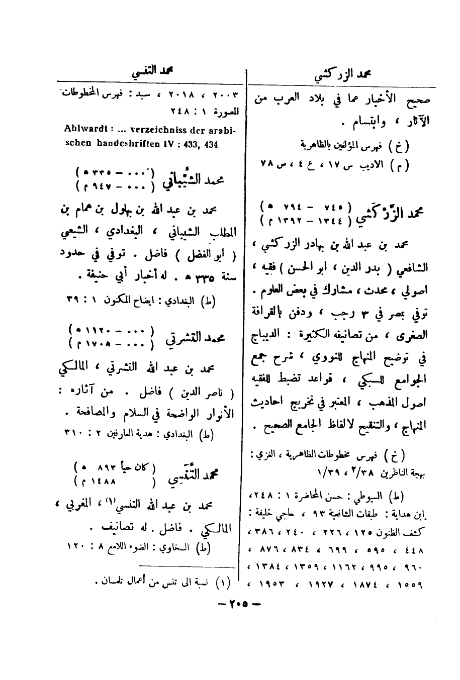 (خ) فهرس المؤلفين بالظاهرية (م) الاديب س 17، ع 4، ص 78 محمد الزركشي (745 - 794 هـ) (1344 - 1392 م) محمد بن عبد الله بن بهادر الزركشي، الشافعي (بدر الدين، أبو الحسن) فقيه، اصولي، محدث، مشارك في بعض العلوم.