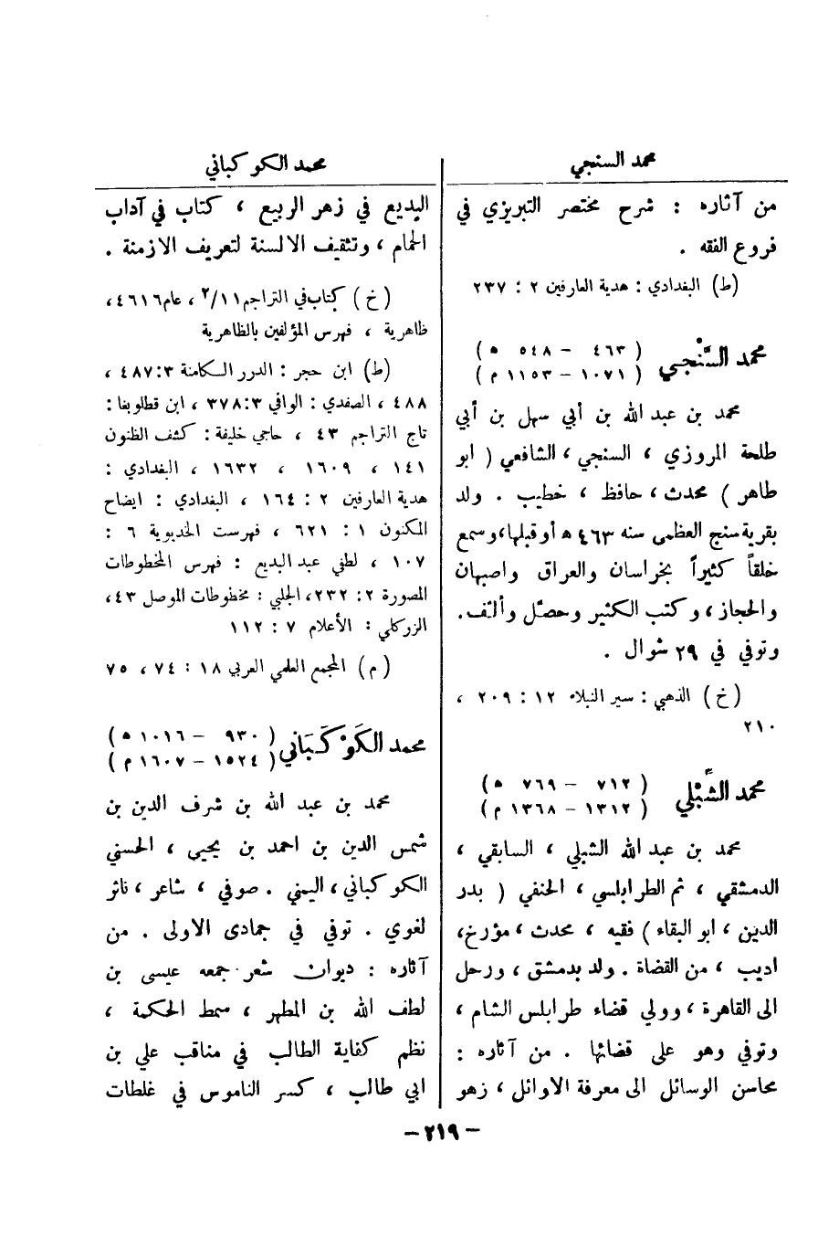 الزركلي: الاعلام 7: 112 (م) المجمع العلمي العربي 18: 74، 75 محمد الكوكباني (930 - 1016 هـ) (1524 - 1607 م) محمد بن عبد الله بن شرف الدين بن شمس الدين بن احمد بن يحيى، الحسني الكوكباني، اليمني.