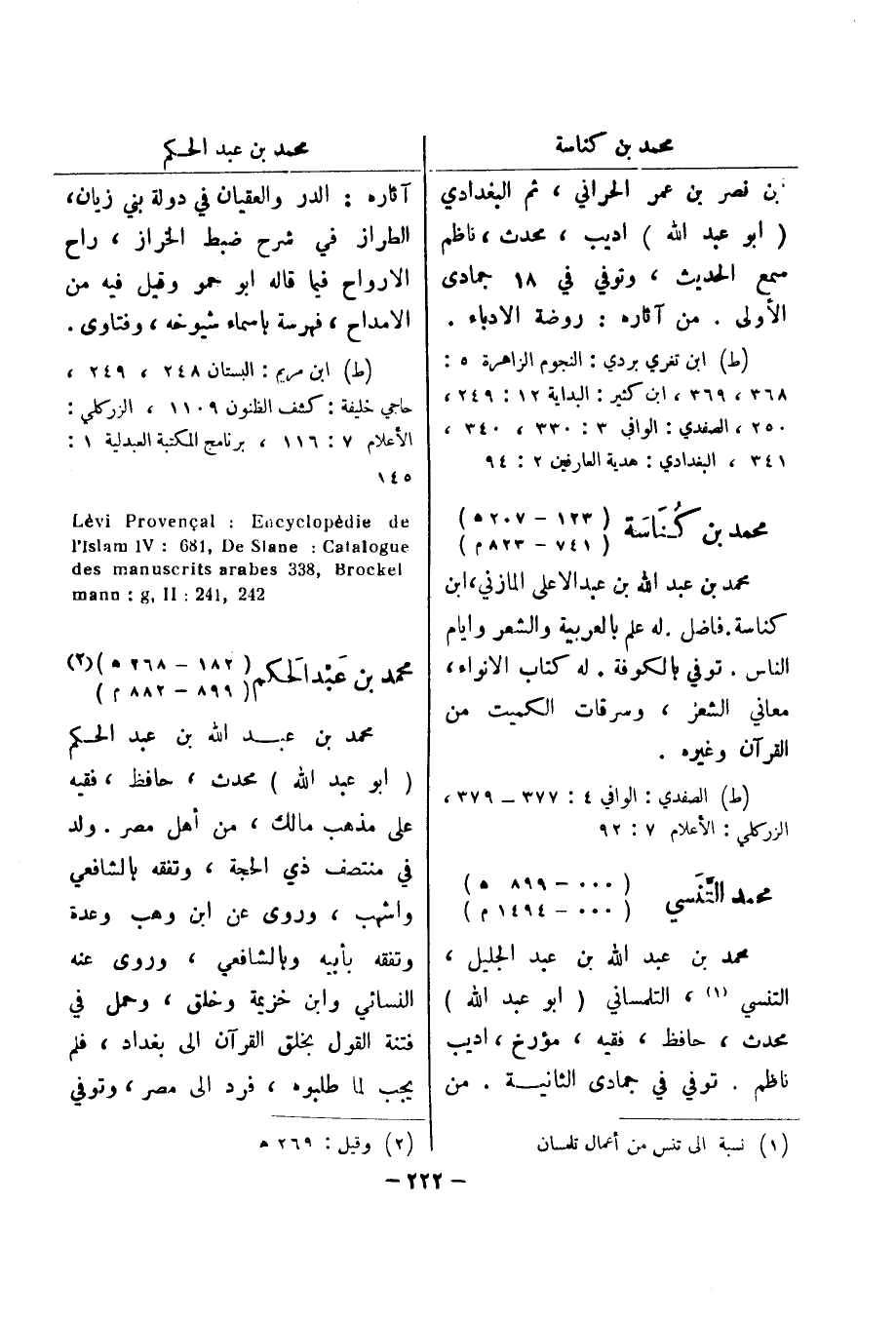 (ط) ابن تغري بردي: النجوم الزاهرة 5: 368، 369، ابن كثير: البداية 12: 249، 250، الصفدي: الوافي 3: 330، 340، 341، البغدادي: هدية العارفين 2: 94 محمد بن كناسة (123 - 207 هـ) (741 - 823 م) محمد بن عبد الله بن عبد الاعلى المازني، ابن كناسة.
