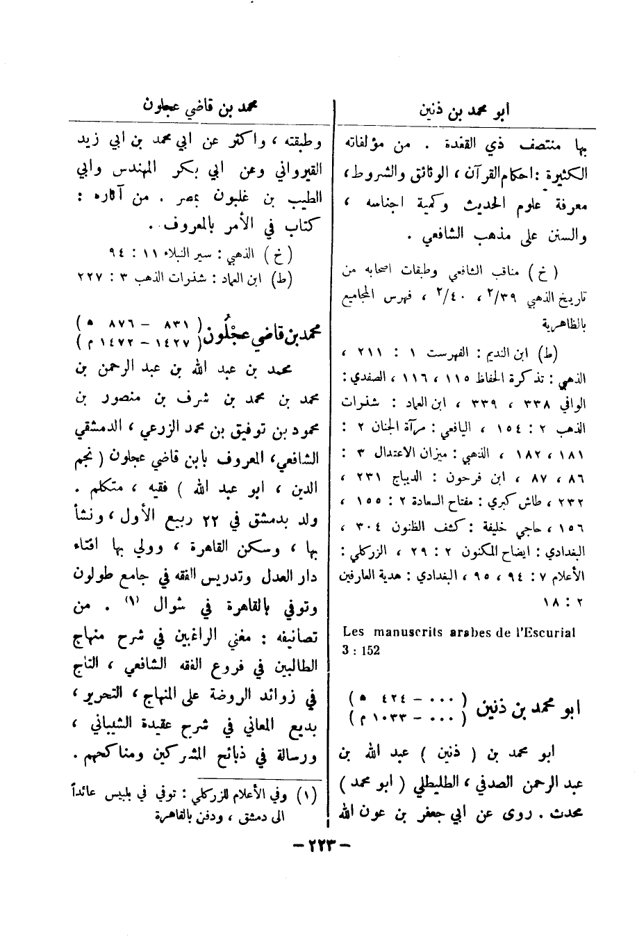 (خ) الذهبي: سير النبلاء 11: 94 (ط) ابن العماد: شذرات الذهب 3: 227 محمد بن قاضي عجلون (831 - 876 هـ) (1427 - 1472 م) محمد بن عبد الله بن عبد الرحمن بن محمد بن محمد بن شرف بن منصور بن محمود بن توفيق بن محمد الزرعي، الدمشقي الشافعي، المعروف بابن قاضي عجلون (نجم الدين، أبو عبد الله) فقيه، متكلم.