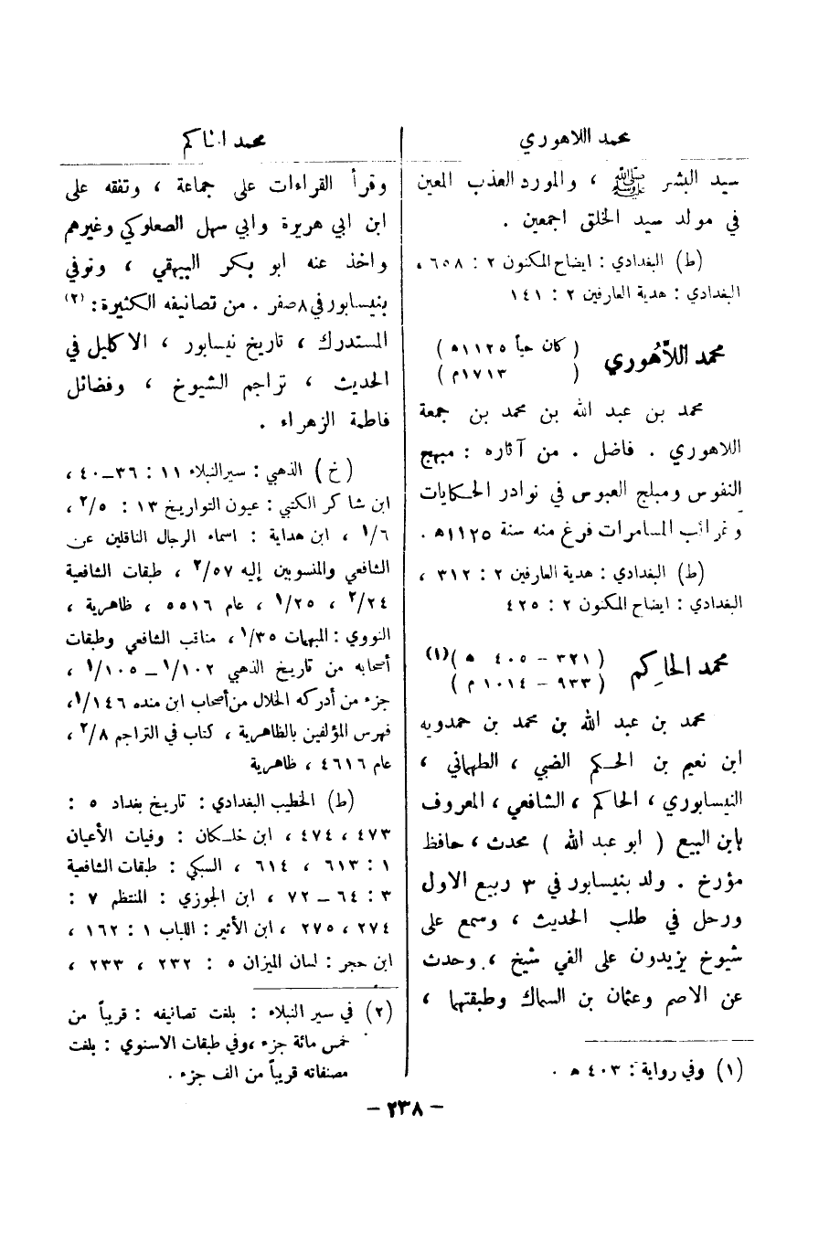 (ط) البغدادي: هدية العارفين 2: 312، البغدادي: ايضاح المكنون 2: 425 محمد الحاكم (321 - 405 هـ) (1) (933 - 1014 م) محمد بن عبد الله بن محمد بن حمدويه ابن نعيم بن الحكم الضبي، الطهماني، النيسابوري، الحاكم، الشافعي، المعروف بابن البيع (أبو عبد الله) محدث، حافظ مؤرخ.