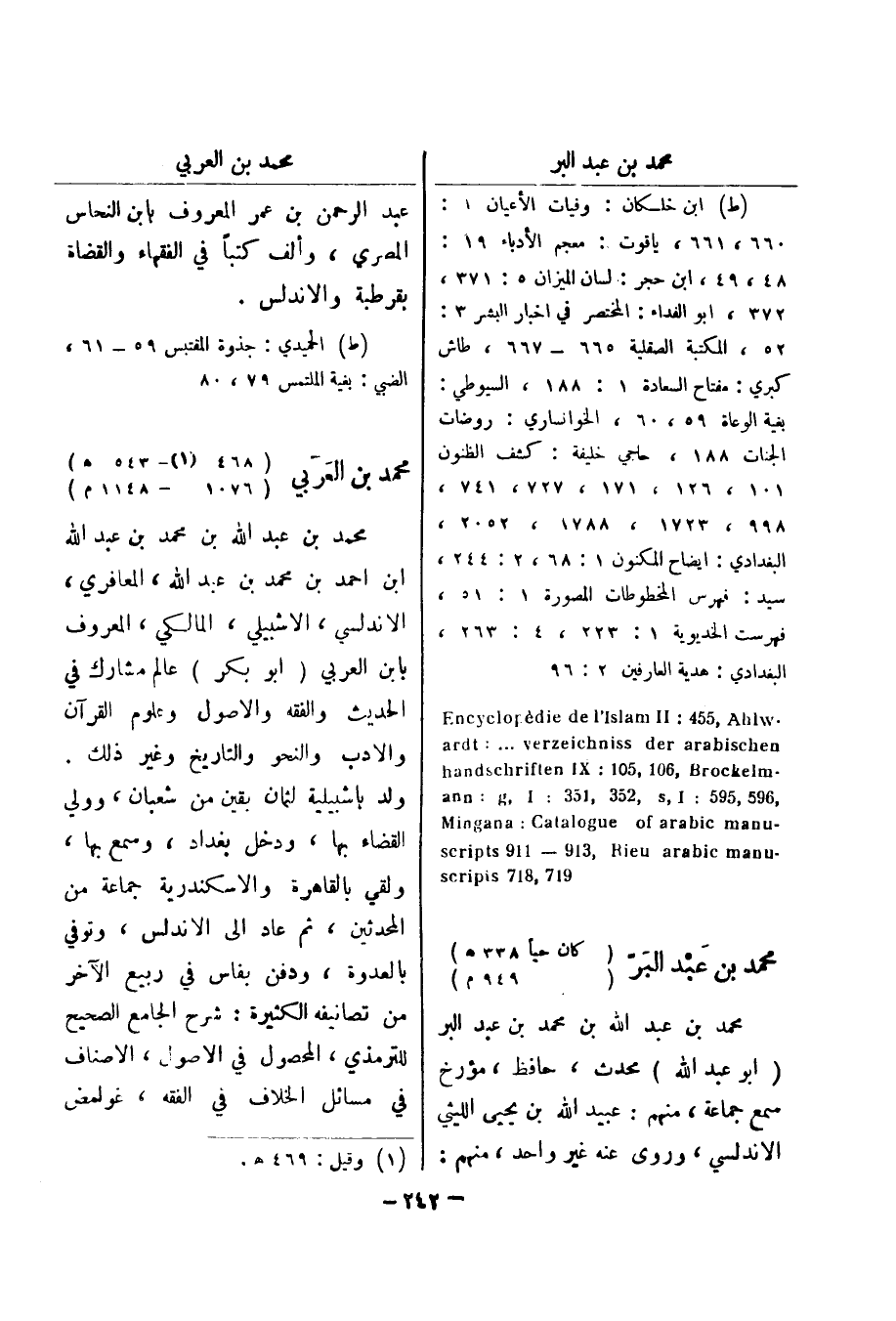 (ط) الحميدي: جذوة المقتبس 59 - 61، الضبي: بغية الملتمس 79، 80 محمد بن العربي (468 (1) - 543 هـ) (1076 - 1148 م) محمد بن عبد الله بن محمد بن عبد الله ابن احمد بن محمد بن عبد الله، المعافري، الاندلسي، الاشبيلي، المالكي، المعروف بابن العربي (أبو بكر) عالم مشارك في الحديث والفقه والاصول وعلوم القرآن
