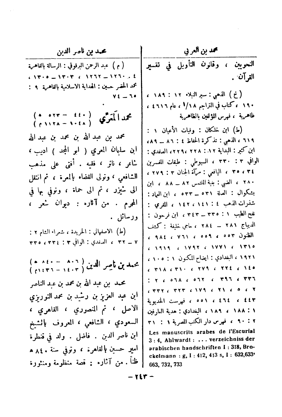 (ط) الاصفهاني: الخريدة، شعراء الشام 2: 7 - 32، الصفدي: الوافي 3: 334، 335 محمد بن ناصر الدين (806 - 840 هـ) (1403 - 1436 م) محمد بن عبد الله بن محمد بن عبد الناصر ابن عبد العزيز بن رشيد بن محمد التوريزي الاصل، ثم المنصوري، القاهري، السعودي، الشافعي، المعروف بالشيخ ابن ناصر الدين.