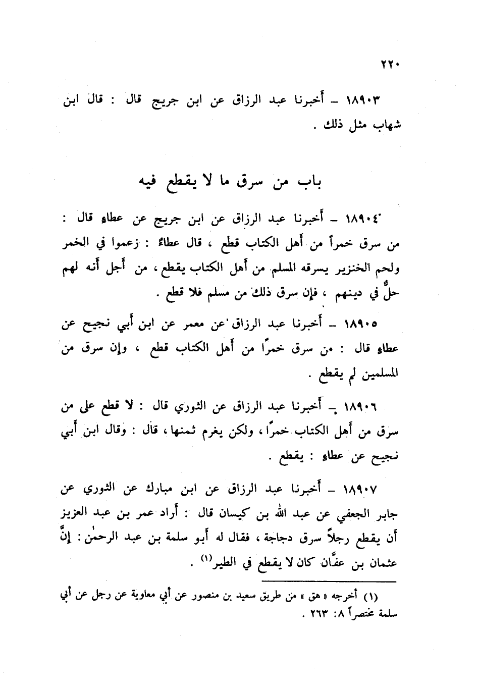 ١٨٩٠٦ - أَخْبَرَنَا عَبْدُ الرَّزَّاقِ، عَنِ الثَّوْرِيِّ , قَالَ: «لَا قَطْعَ عَلَى مَنْ سَرَقَ مِنْ أَهْلِ الْكِتَابِ خَمْرًا , وَلَكِنْ يَغْرَمُ ثَمَنَهَا» قَالَ: وَقَالَ ابْنُ أَبِي نَجِيحٍ , عَنْ عَطَاءٍ: «يُقْطَعُ»