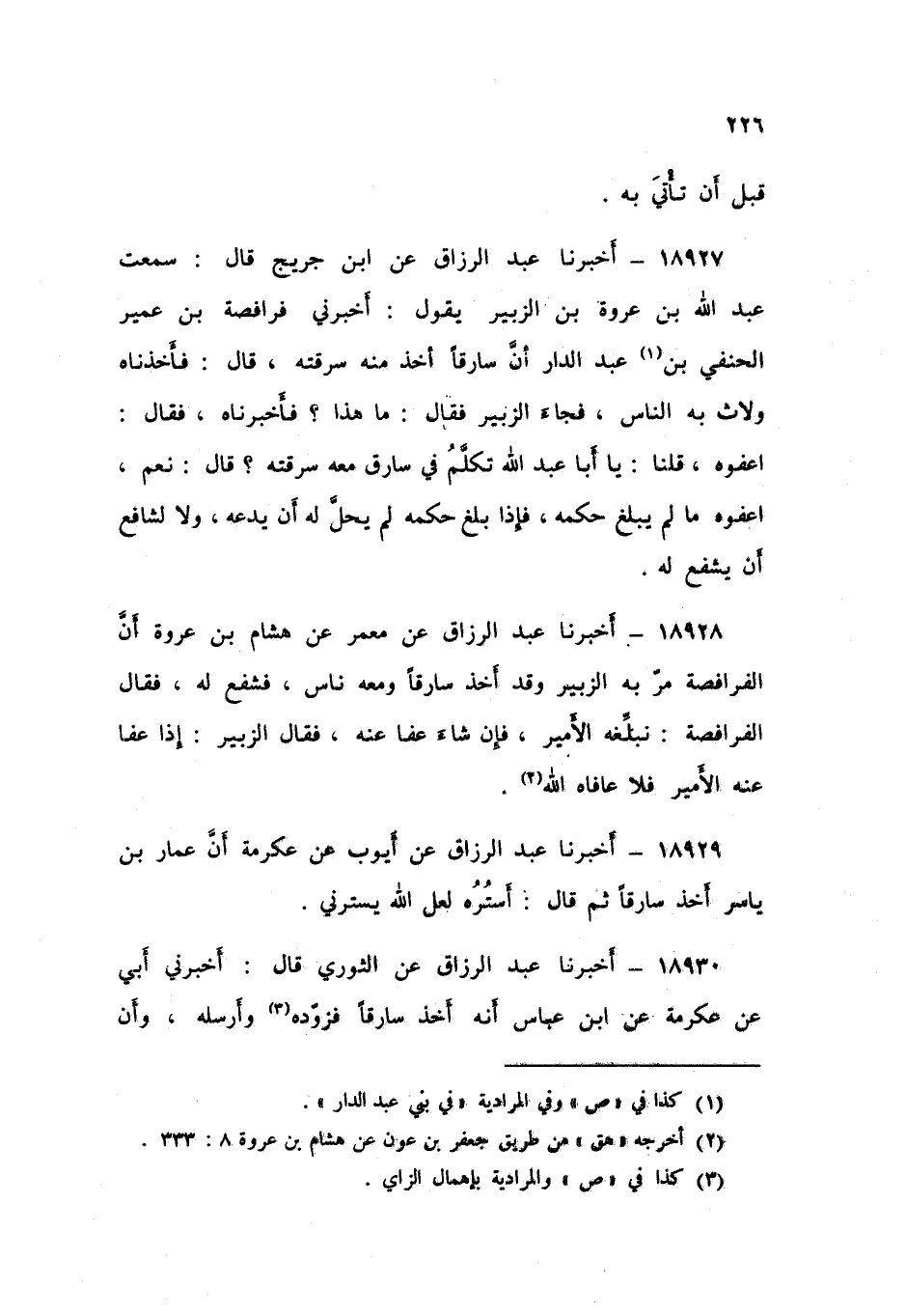 ١٨٩٢٨ - أَخْبَرَنَا عَبْدُ الرَّزَّاقِ، عَنْ مَعْمَرٍ , عَنْ هِشَامِ بْنِ عُرْوَةَ , أَنَّ الْفُرَافِصَةَ , مَرَّ بِهِ الزُّبَيْرُ وَقَدْ أَخَذَ سَارِقًا , وَمَعَهُ نَاسٌ , فَشَفَعَ لَهُ , فَقَالَ الْفُرَافِصَةُ: نُبَلِّغُهُ الْأَمِيرَ فَإِنْ شَاءَ عَفَا عَنْهُ , فَقَالَ الزُّبَيْرُ: «إِذَا عَفَا عَنْهُ الْأَمِيرُ فَلَا عَافَاهُ اللَّهُ»