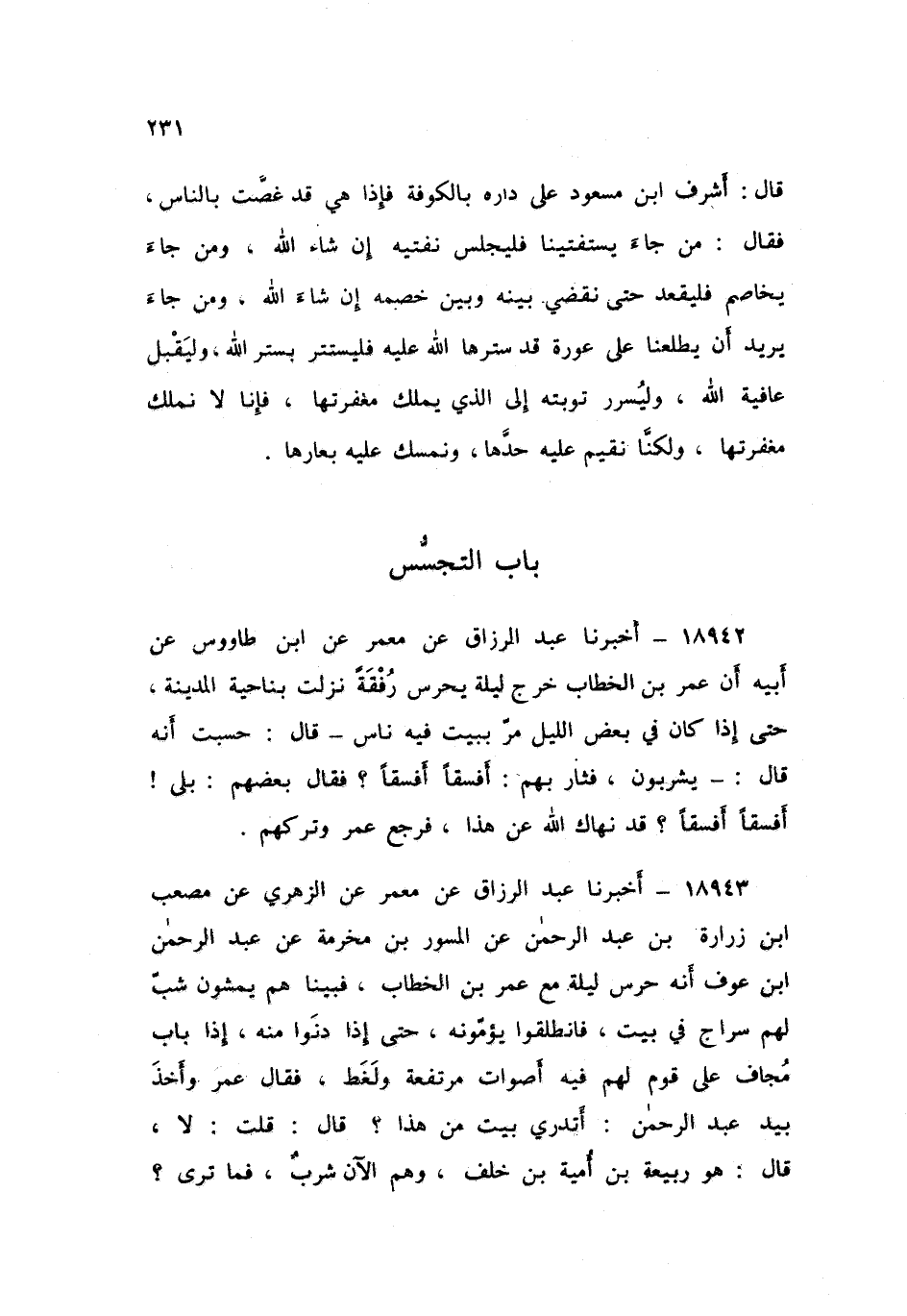 ١٨٩٤٣ - أَخْبَرَنَا عَبْدُ الرَّزَّاقِ، عَنْ مَعْمَرٍ , عَنِ الزُّهْرِيِّ , عَنْ مُصْعَبِ بْنِ زُرَارَةَ بْنِ عَبْدِ الرَّحْمَنِ , عَنِ الْمِسْوَرِ بْنِ مَخْرَمَةَ , عَنْ عَبْدِ الرَّحْمَنِ بْنِ عَوْفٍ , أَنَّهُ حَرَسَ لَيْلَةً مَعَ عُمَرَ بْنِ الْخَطَّابِ فَبَيْنَا هُمْ يَمْشُونَ شَبَّ لَهُمْ سِرَاجٌ فِي بَيْتٍ , فَانْطَلَقُوا يَؤُمُّونَهُ , حَتَّى إِذَا دَنَوْا مِنْهُ إِذَا بَابٌ مُجَافٍ عَلَى قَوْمٍ لَهُمْ فِيهِ أَصْوَاتٌ مُرْتَفِعَةٌ وَلَغَطٌ , فَقَالَ عُمَرُ وَأَخَذَ بِيَدِ عَبْدِ الرَّحْمَنِ: «أَتَدْرِي بَيْتُ مَنْ هَذَا؟» قَالَ: قُلْتُ: لَا , قَالَ: «هُوَ رَبِيعَةَ بْنِ أُمَيَّةَ بْنِ خَلَفٍ وَهُمُ الْآنَ شُرَّبٌ، فَمَا تَرَى؟» قَالَ عَبْدُ الرَّحْمَنِ: أَرَى قَدْ أَتَيْنَا مَا نَهَانَا اللَّهُ عَنْهُ، نَهَانَا اللَّهُ فَقَالَ: {وَلَا تَجَسَّسُوا} [الحجرات: ١٢] فَقَدْ تَجَسَّسْنَا «فَانْصَرَفَ عَنْهُمْ عُمَرُ وَتَرَكَهُمْ»