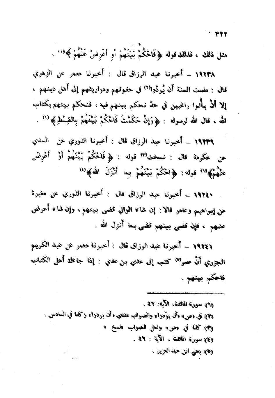 ١٩٢٤٠ - أَخْبَرَنَا عَبْدُ الرَّزَّاقِ، أَخْبَرَنَا الثَّوْرِيُّ , عَنْ مُغِيرَةَ , عَنْ إِبْرَاهِيمَ , وَعَامِرٍ قَالَا: «إِنْ شَاءَ الْوَالِي قَضَى بَيْنَهُمْ , وَإِنْ شَاءَ أَعْرَضَ عَنْهُمْ , فَإِنْ قَضَى بَيْنَهُمْ قَضَى بِمَا أَنْزَلَ اللَّهُ»