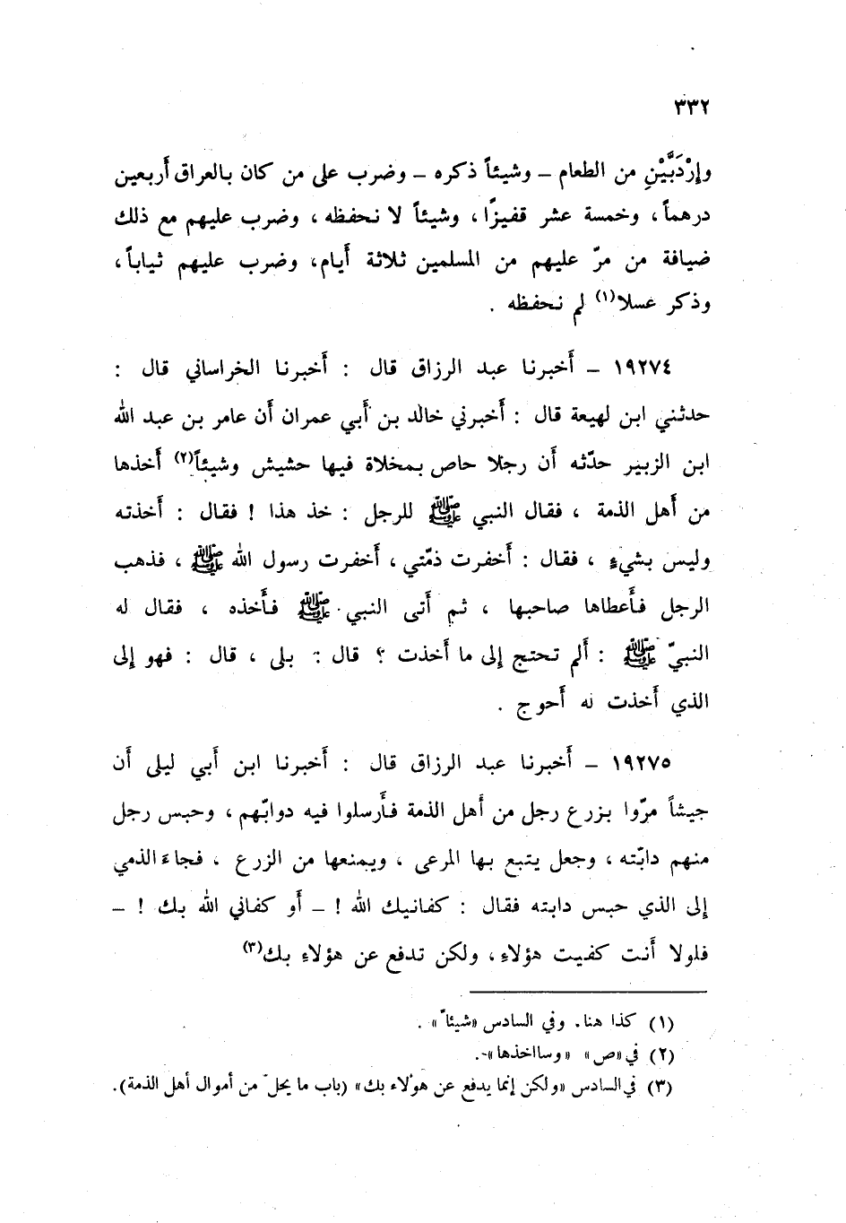 ١٩٢٧٥ - عَبْدُ الرَّزَّاقِ قال: أَخْبَرَنَا ابْنُ أَبِي لَيْلَى «أَنَّ جَيْشًا مَرُّوا بِزَرْعِ رَجُلٍ مِنْ أَهْلِ الذِّمَّةِ فَأَرْسَلُوا فِيهِ دَوَابَّهُمْ وَحَبَسَ رَجُلٌ مِنْهُمْ دَابَّتَهُ , وَجَعَلَ يَتَّبِعُ بِهَا الْمَرْعَى وَيَمْنَعُهَا مِنَ الزَّرْعِ , فَجَاءَ الذِّمِّيُّ إِلَى الَّذِي حَبَسَ دَابَّتَهُ» , فَقَالَ: «كَفَانِيكَ اللَّهُ - أَوْ كَفَانِي اللَّهُ - بِكَ، فَلَوْلَا أَنْتَ كَفَيْتَ هَؤُلَاءِ وَلَكِنْ تَدْفَعُ عَنْ هَؤُلَاءِ بِكَ»