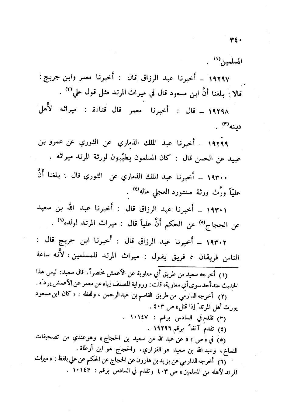 ١٩٣٠٢ - عَبْدُ الرَّزَّاقِ قال: أَخْبَرَنَا ابْنُ جُرَيْجٍ قَالَ: النَّاسُ فَرِيقَانِ , فَرِيقٌ يَقُولُ: «مِيرَاثُ الْمُرْتَدِّ لِلْمُسْلِمِينَ لِأَنَّهُ سَاعَةَ يَكْفُرُ يُوقَفُ عَنْهُ فَلَا يُقْدَرُ مِنْهُ عَلَى شَيْءٍ حَتَّى يُنْظَرَ أَيُسْلِمُ أَمْ يَكْفُرُ مِنْهُمْ النَّخَعِيُّ , وَالشَّعْبِيُّ , وَالْحَكَمُ بْنُ عُتَيْبَةَ» وَفَرِيقٌ يَقُولُونَ لِأَهْلِ دِينِهِ